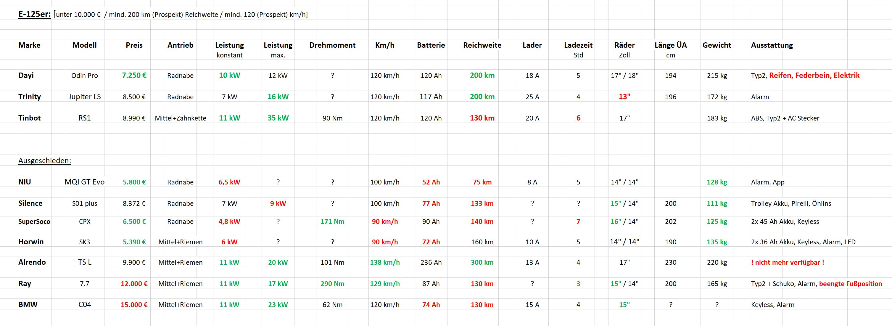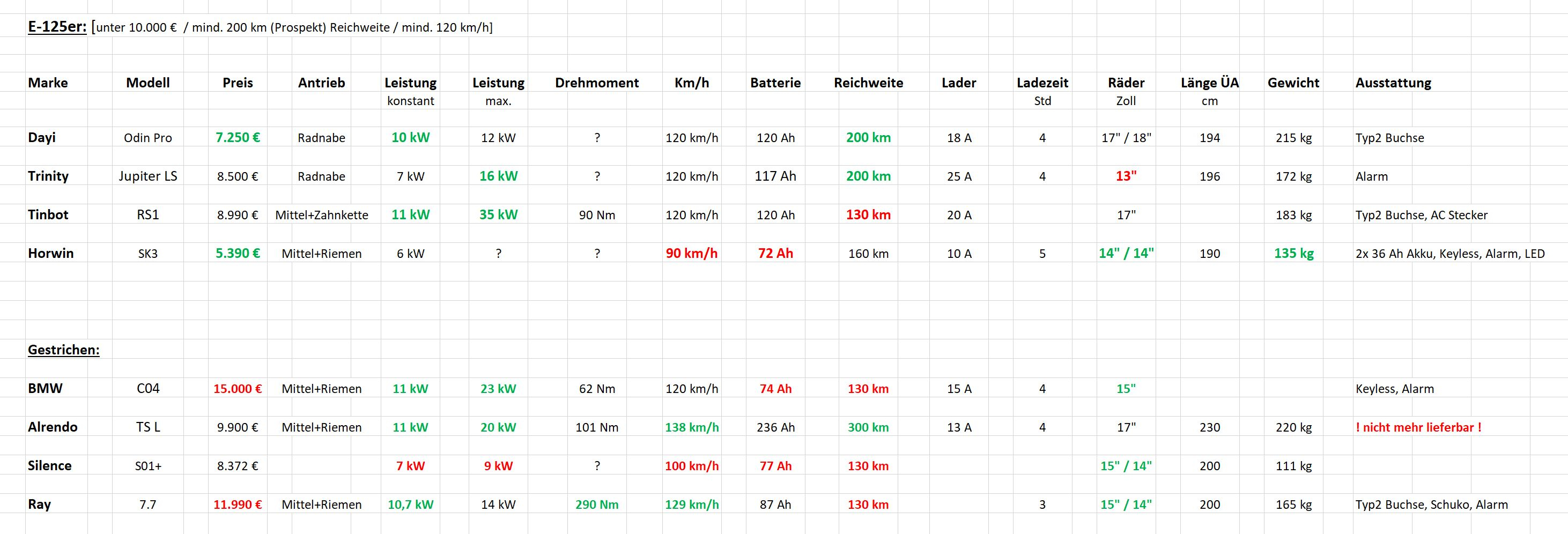 Nicht alle der Fahrzeuge auf der Liste nutzen 20s-Akkus mit 72V Nennspannung (Ray: 89V, S01: 51V). Die Energiemenge in kWh in der Liste aufzuführen, würde Vergleichen vereinfachen. Die Fahrzeuge mit Typ 2 und der S01 haben ein Ladegerät mit drin, Der Jupiter SL offenbar nicht mehr (Jupiter 11 hatte das).