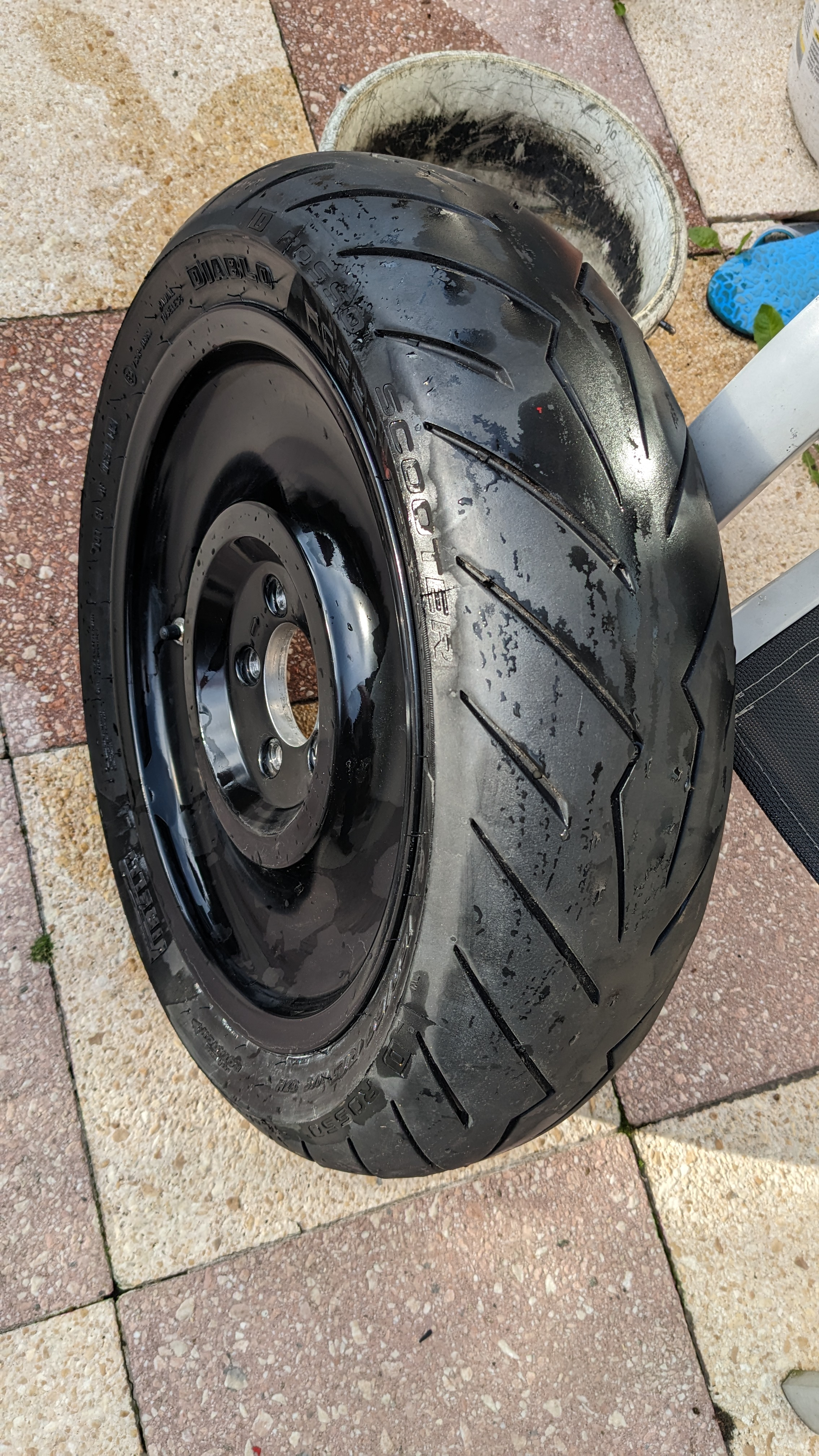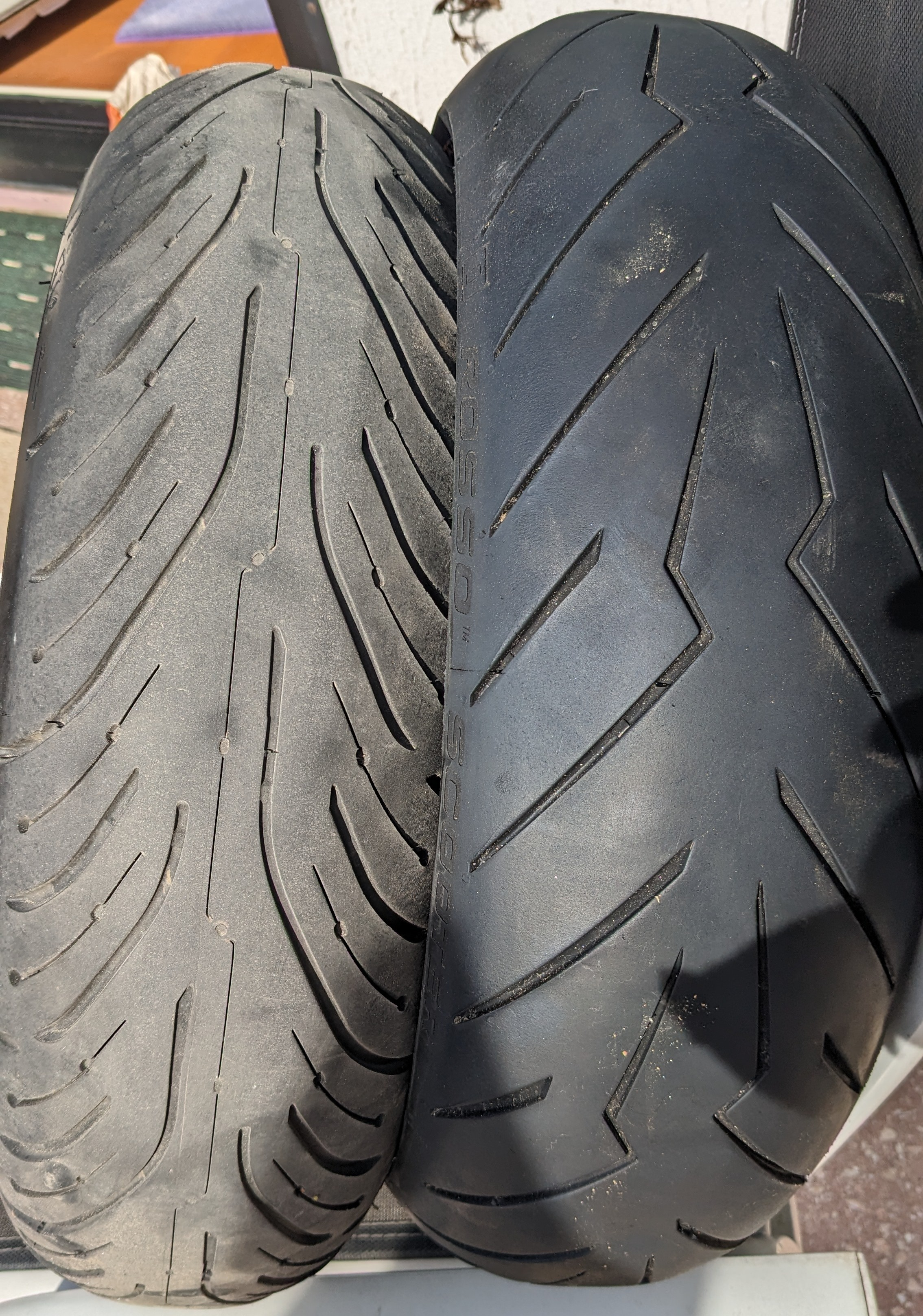 [Updated wegen Fehlerkorrektur!] Pilot Road 4 nach 4200km hinten am Limit. Vorne geht noch. Tausch gegen gebrauchten Pirelli mit knapp 3mm. Der tut noch ein wenig, dann kommt alles neu drauf.