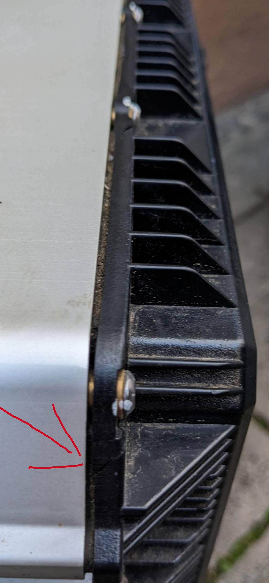 Bild 2: Dies ist an der vorderen Abdeckung. Interessanterweise gibt es diese Absplitterung nahezu symmetrisch auch auf der anderen Seite des Akkus (nicht gezeigt). Diese Absplitterung ist mir recht unerklärlich, weil man hier eigentlich nirgends anstoßen kann. Deshalb gehe ich eher von einer Spannungssituation aus, gerade auch weil die Stelle symmetrisch auch auf der anderen Seite gebrochen ist. Evtl. durch Hebelkräfte ausgehend vom Trolleygriff? Daneben gibt es noch 2 weitere sehr kleine Absplitterungen (wenige mm) entlang der Dichtung vorn oben weiter mittig.