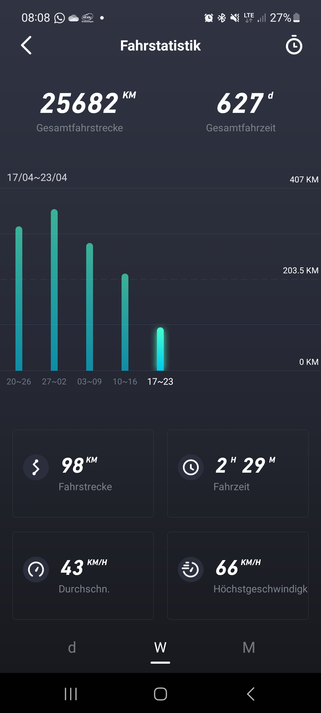 30.030 km und er läuft weiter gut, der Akku ist schwächer geworden, reicht noch von 80% auf 20% für 25km, umgerechnet von 100% auf 0% dürften das also ca. 41 km sein.