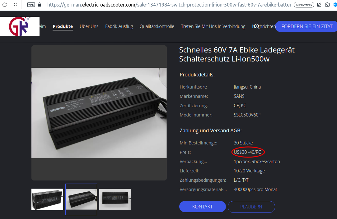 Das 7A-Ladegerät gibt 's bei NovaMotors noch für 180 € (Versand ist kostenlos). Ist halt die Frage, ob man so viel dafür ausgeben will. Ich habe dasselbe vor einem Jahr bei E-Kuma noch für 110 € incl. Versand bekommen.