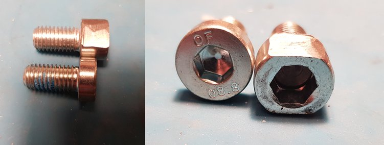 Danke für die vielen Details. Also ist der "Hohlkopf" doch deutlich größer als gedacht. Egal. Ich hatte noch eine ähnliche Inbus im Fundus. Ist ganz normales M10. Die habe ich innen auf reichliche 8 mm aufgebohrt (der Bolzen des Schlosses ist laut Skizzen nur 8mm dick und passt dann saugend rein). Dem Kopf habe ich seitlich zwei Glatzen gefeilt, damit ein Maulschlüssel SW13 drauf passt zum Anziehen der Radschraube. Zusätzlich den Kopf von unten noch ein wenig angeschrägt, so dass er nur auf dem inneren Kugellagerring des Rades aufliegt. Zusammen mit einer ebenso passenden U-Scheibe auf der anderen Seite dreht das Rad frei und ungehemmt und besser als das originale auf der anderen Seite.