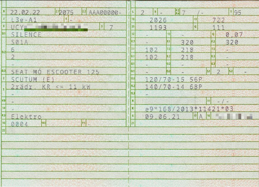 Dass auf meinem Schein die Höchstgeschwindigkeit des Rollers mit 124 km/h angegeben war, hatte ich noch allein herausgefunden, ihr fiel dann auch noch auf, dass mein Roller keine Sitze hatte (Feld S.1). Jetzt heißt das Teil auch Mo 125. Pate vieler Daten waren zudem die drei vor mir im Landkreis zugelassenen Mo's oder S01. Auch die bei den Versicherungen geführte HSN/TSN 2075/AAA(000000) sind hier zu finden.