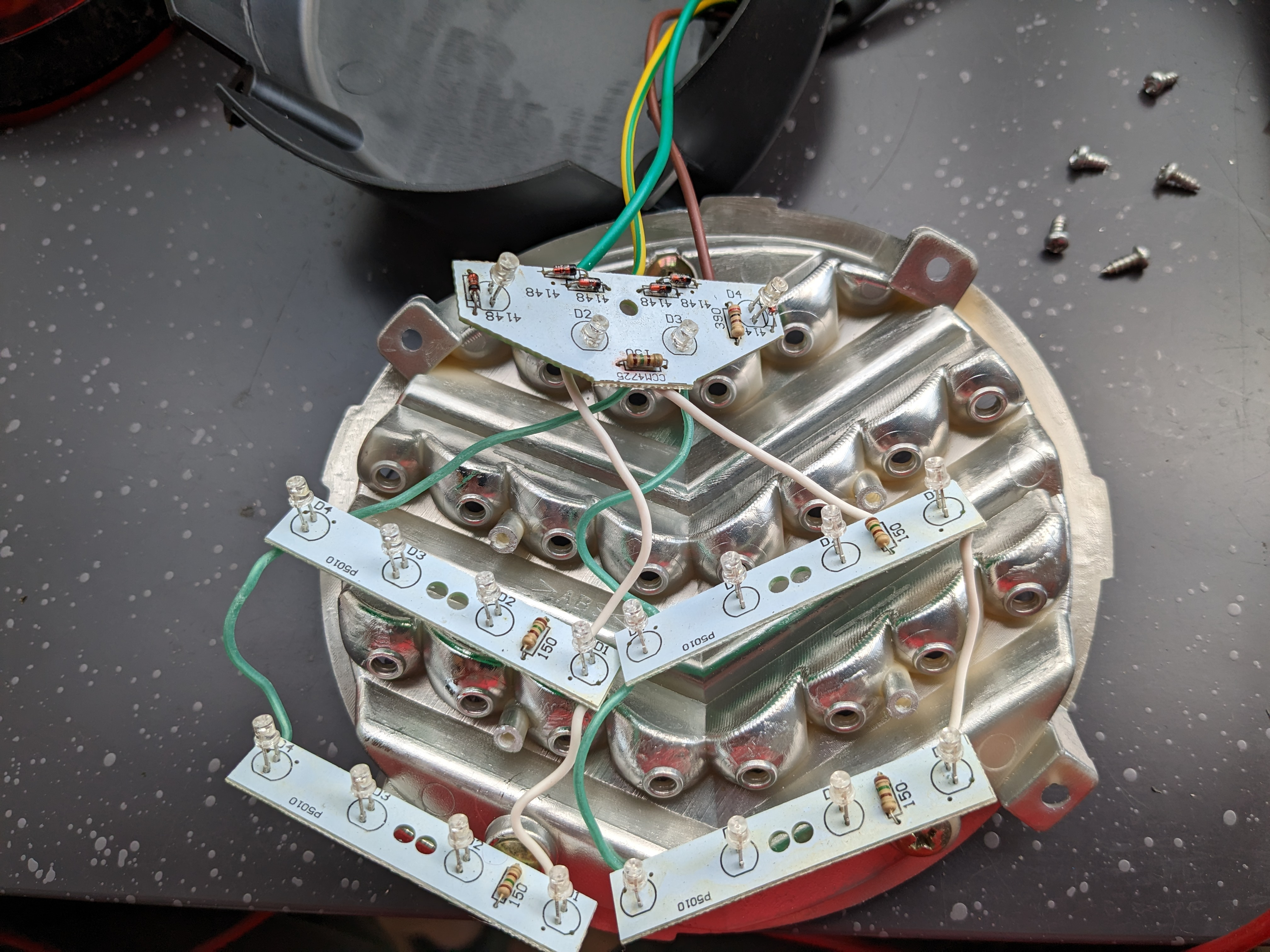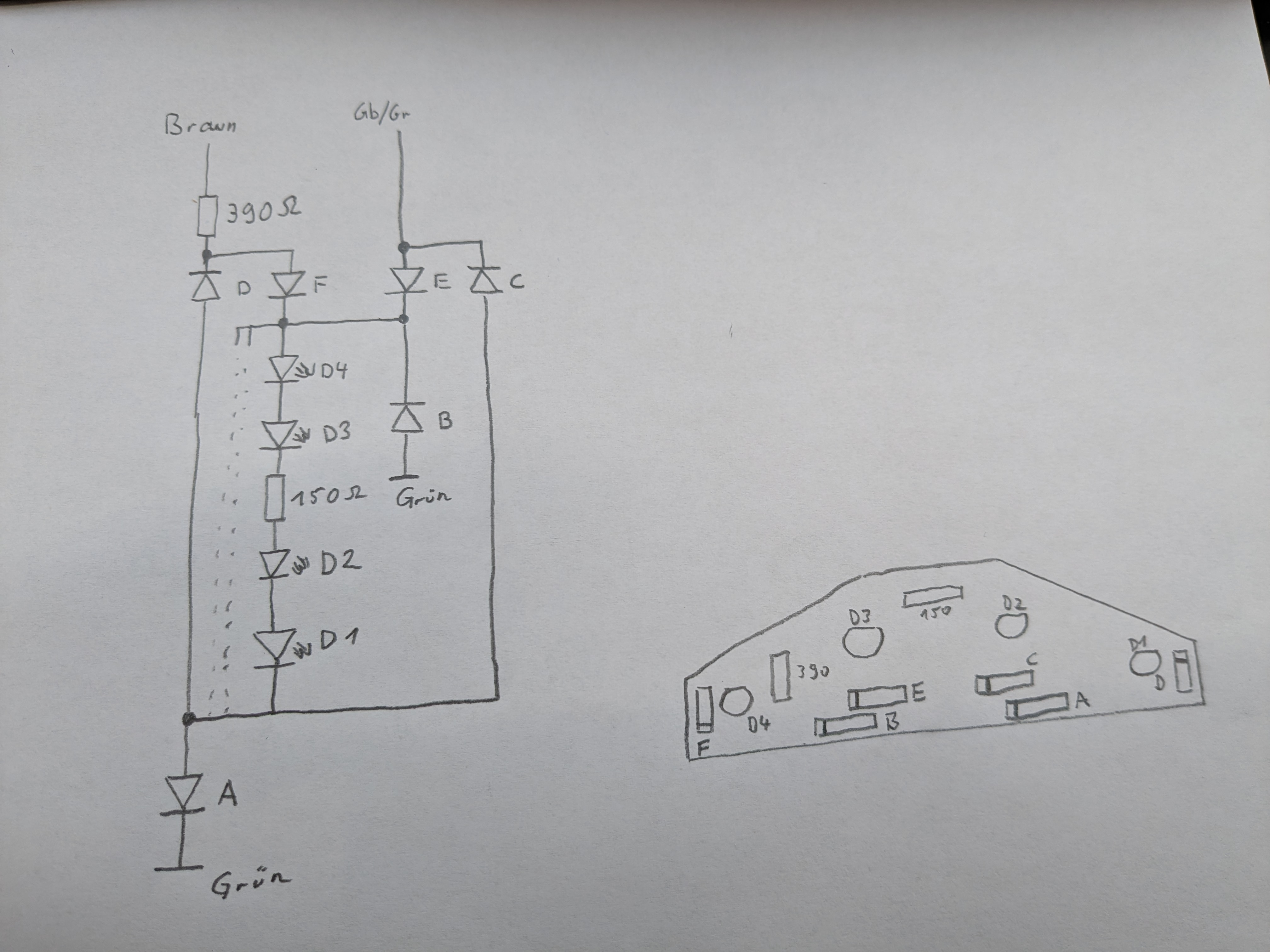 ich habe das Rücklicht ausgebaut. Dann 12V an Braun und Grün (Masse) angeschlossen. Auf der Gelb/Grünen Leitung habe ich die 7,2V gemessen.