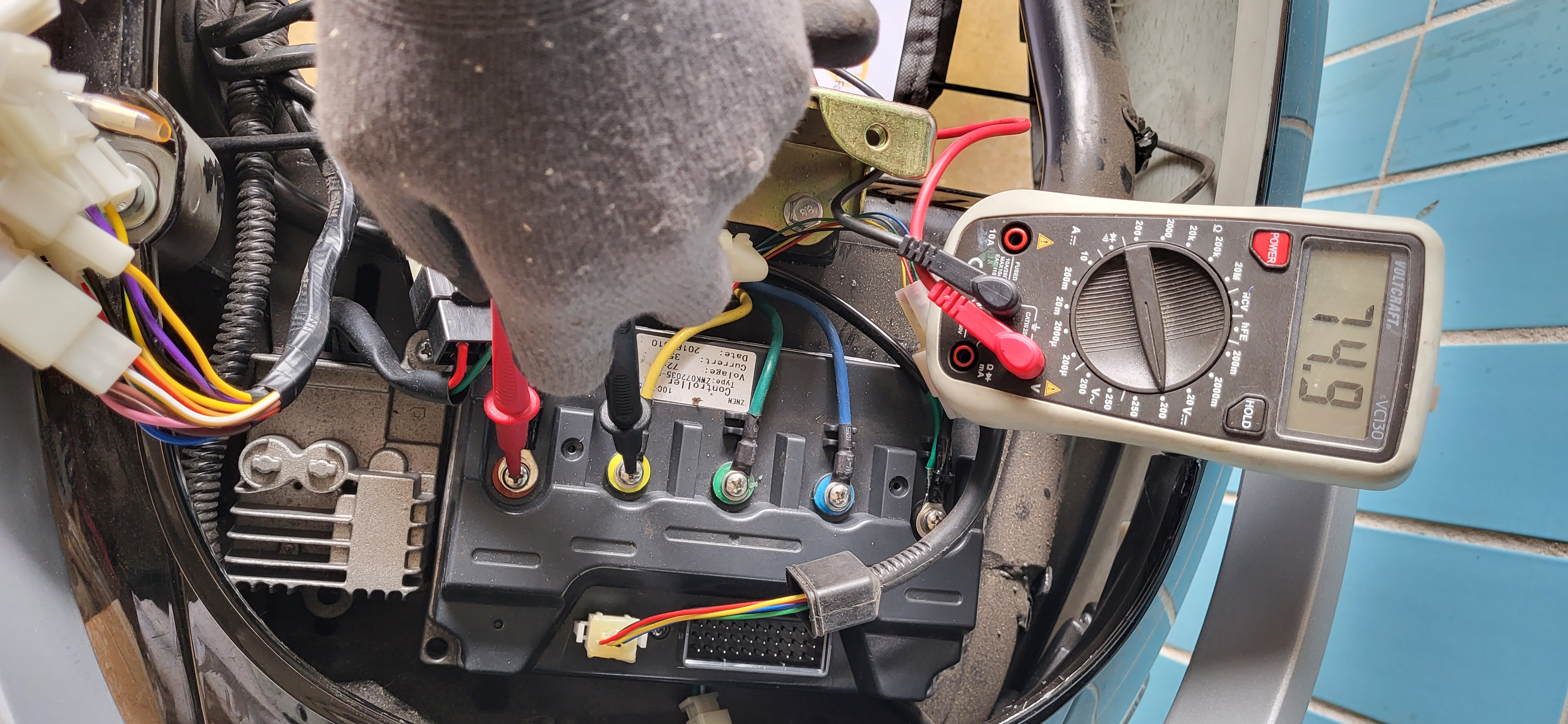 vom Tisch wäre sie, wenn Du viermal -74,9 Vollt gemessen hättest zwischen dem Controller-Eingang Plus zu den Ausgängen Blau, Gelb, Grün sowie dem Eingang Minus. Meine Vermutung ist, dass vier Messwerte den Wert ergeben haben (alle vier gleich) und die Angabe "alle drei gleich" in Deinem post offen lässt, was am Minus/GND-Punkt gemessen wurde.