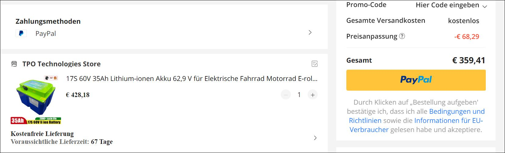 Bei Akkus kann man aber Glück haben, weil Solar-Akkus nicht besteuert werden und der Zoll im Hafen, da ggf. nicht so genau erkennt, ob Solar- oder Fahrzeug-Akku. Mein Rat: Akkus und Akku-Zellen immer alleine bestellen. Gemischte Sendungen z. B. "Parts for Ebike" provozieren eine Versteuerung/Verzollung der gesamten PayPal-Zahlungssumme.