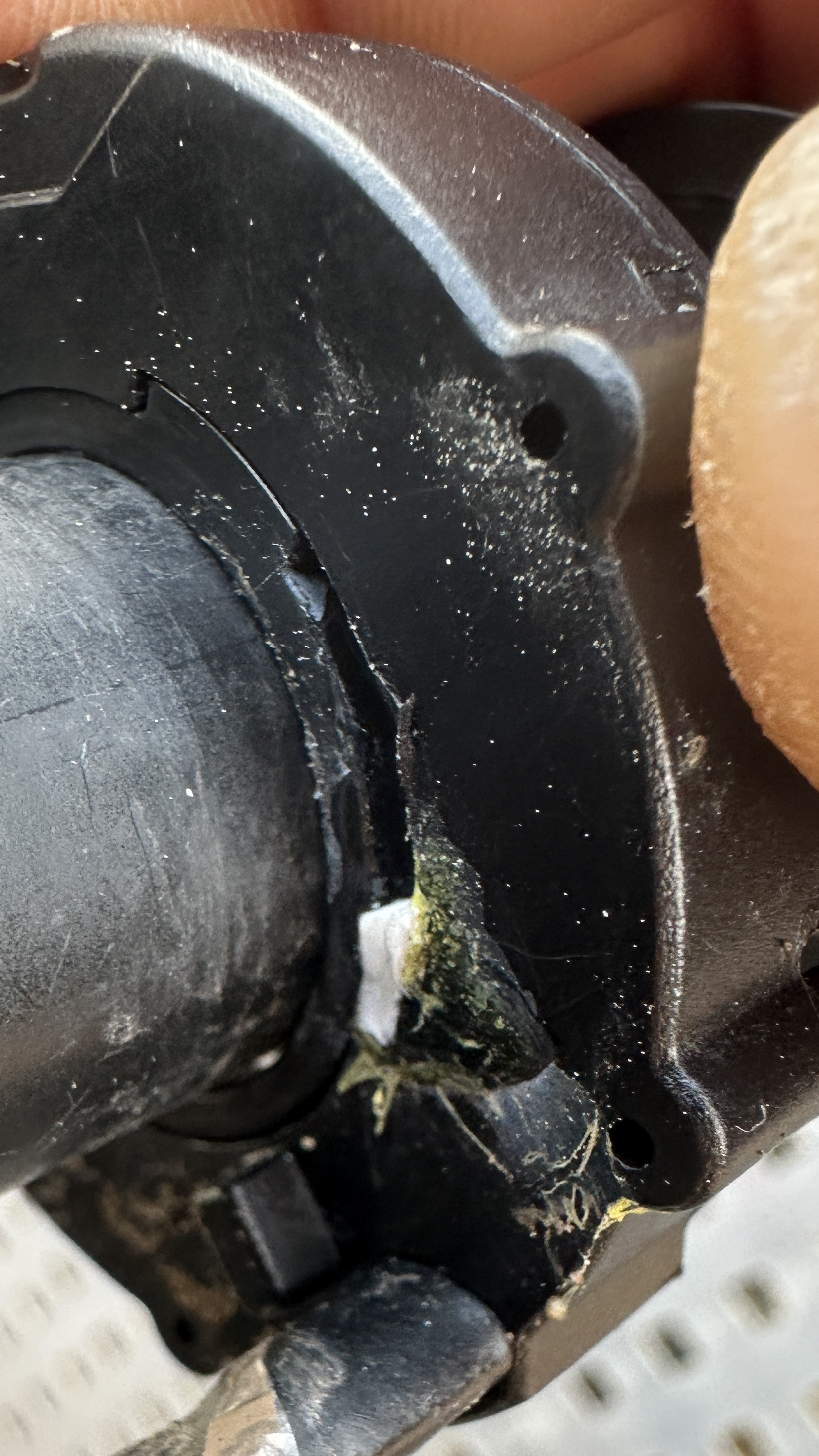 So als Tipp: Als Begrenzungsplastik eignet sich hervorragend die Oberkante eines Joghurtbechers. Da schneidet man ein kleines Stück zusammen mit noch einem Stück des Weichplastiks mit der Schere heraus, und klemmt es hinein. Kann man noch einkleben, würde aber auch so halten. Vorteil der Joghurtbecherkante: Die ist schon grob so gebogen wie der Gasgriff, und hält wie gesagt eigentlich auch ohne Kleber.