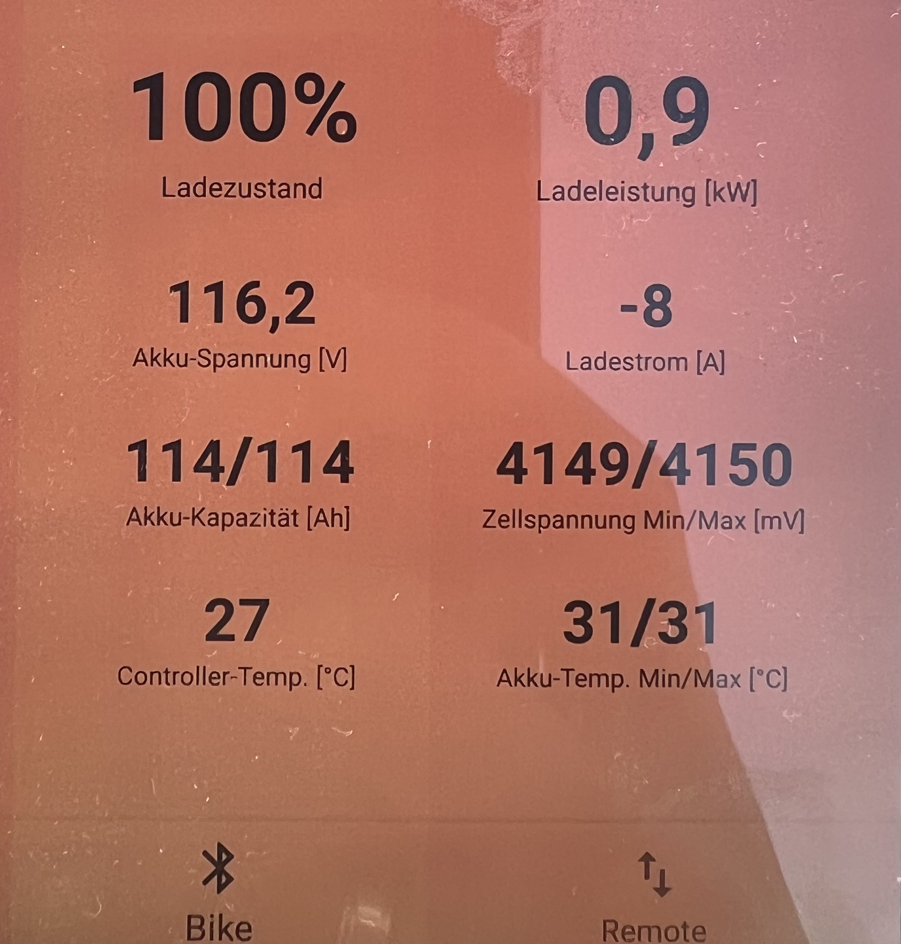 Rechnerisch gingen wohl 11.7kwh in die Batterie. Knapp 7000km Laufleistung. Also 0.9kwh Verlust seitdem. Wenn ich es innerhalb der 5 Jahre schaffe den Akku auf 10kwh knapp zu rocken kriege ich noch ne neue Batterie kurz vor Ende