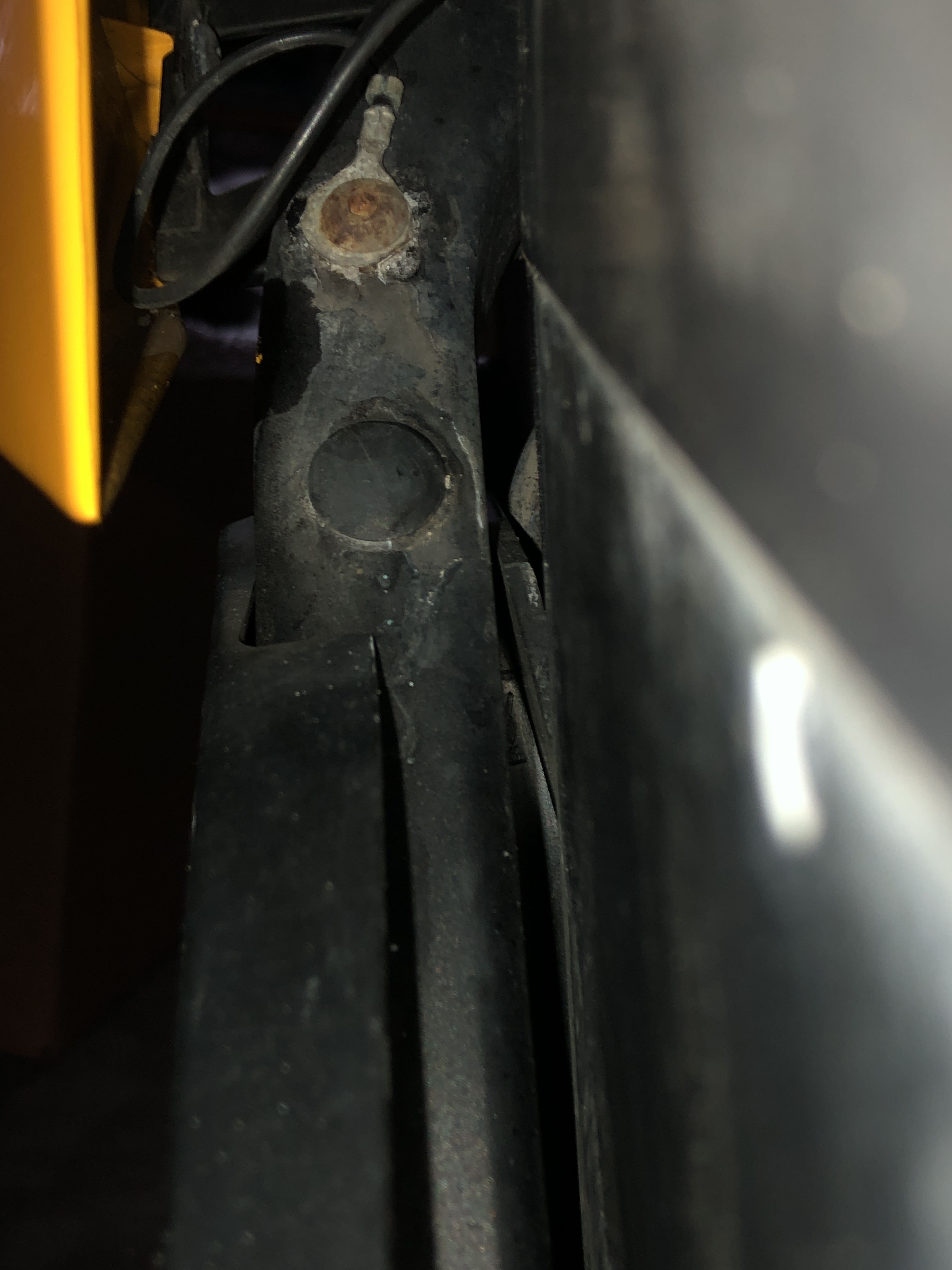 Die oberen Befestigungspunkte sind schon im Rahmen hinter dem hintersten Zipfel der "Tank"verkleidung versteckt. Rechts waren nur einer der extrem schwer hauszubringeden Schutzstopfen drin, links war auch noch ein Massepunkt eingeschraubt, der dankenswerterweise gerade noch so lösbar war, obwohl ebenfalls Billigstschraube: .