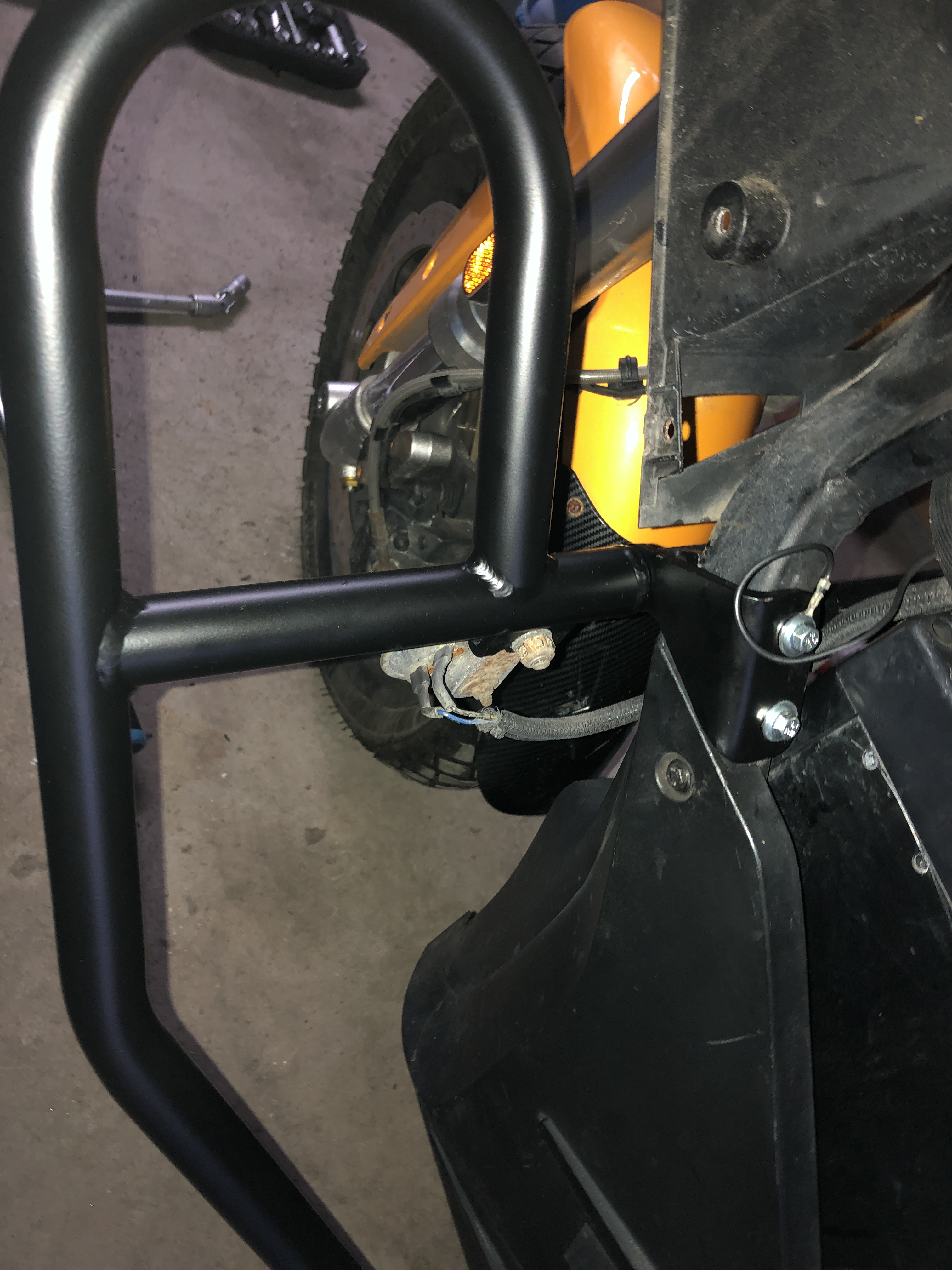 Alle, die meinen, dass die Fallbügel reine Show sind, kann ich beruhigen: Das ist eine extrem robuste Stahlbau-Lösung, an der man das Mopped auch getrost z.B. zum Transport verspannen kann.