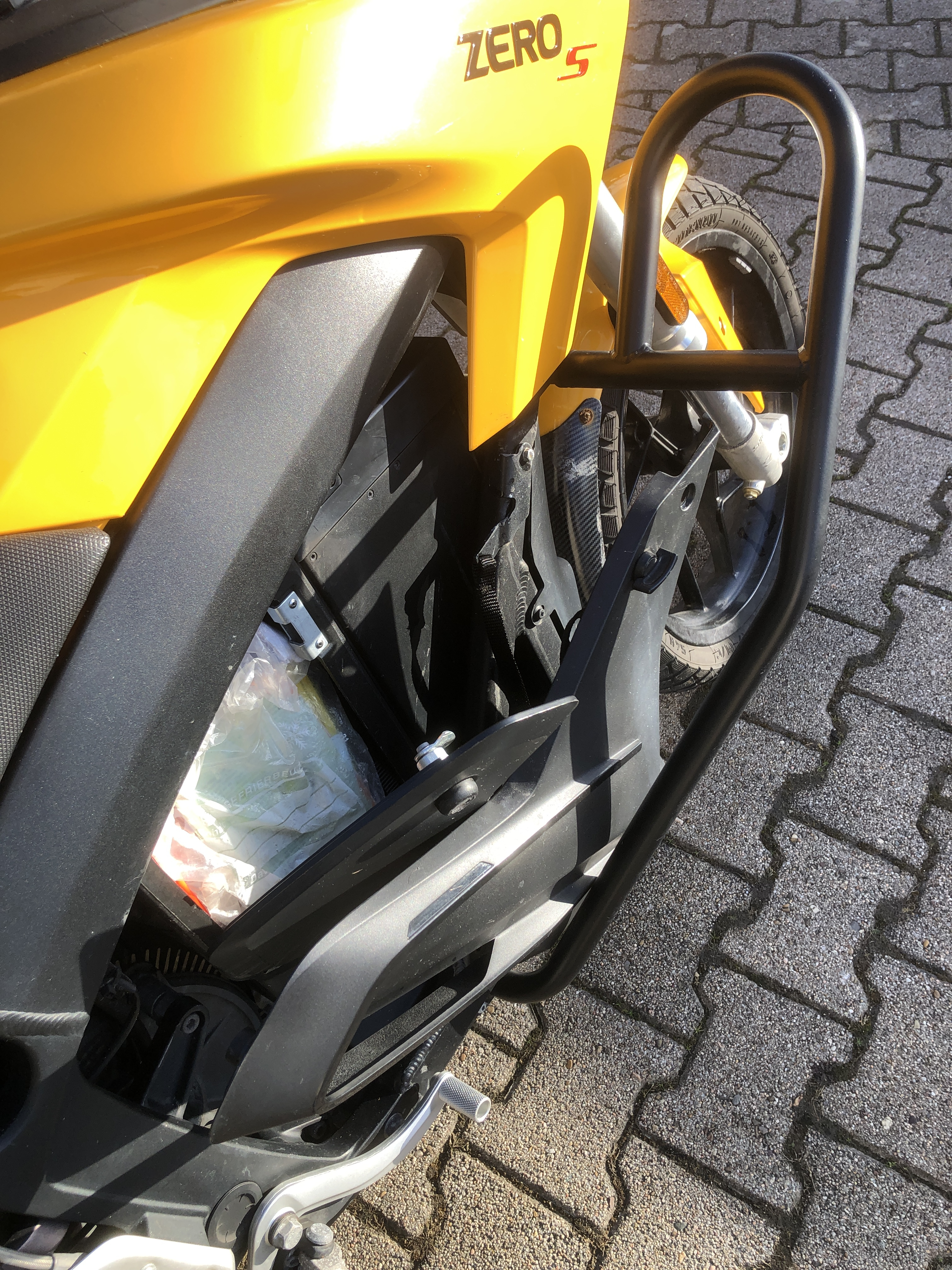 Für Zeros mit dem halben Longbrick Akku und Staufach dahinter ist zu bemerken, dass sich die rechte Seitenverkleidung nur noch wenig innerhalb des rechten Rohres aufklappen lässt, und somit auch der Staufachdeckel nur wenig aufklappen lässt. Geht aber bei mir noch: .