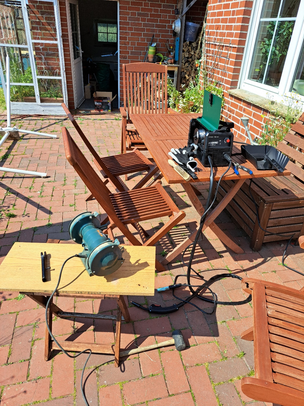 Anbei paar Bilder von vorher, der Reparatur und dem montierten Endergebnis. Den Ständer habe ich demontiert, im Schraubstock des Nachbarn geradegbogen und auf der Terasse Stück für Stück mit kleinen Punkten geschweißt und geschliffen. Anschließend grundiert, lackiert und dann montiert.