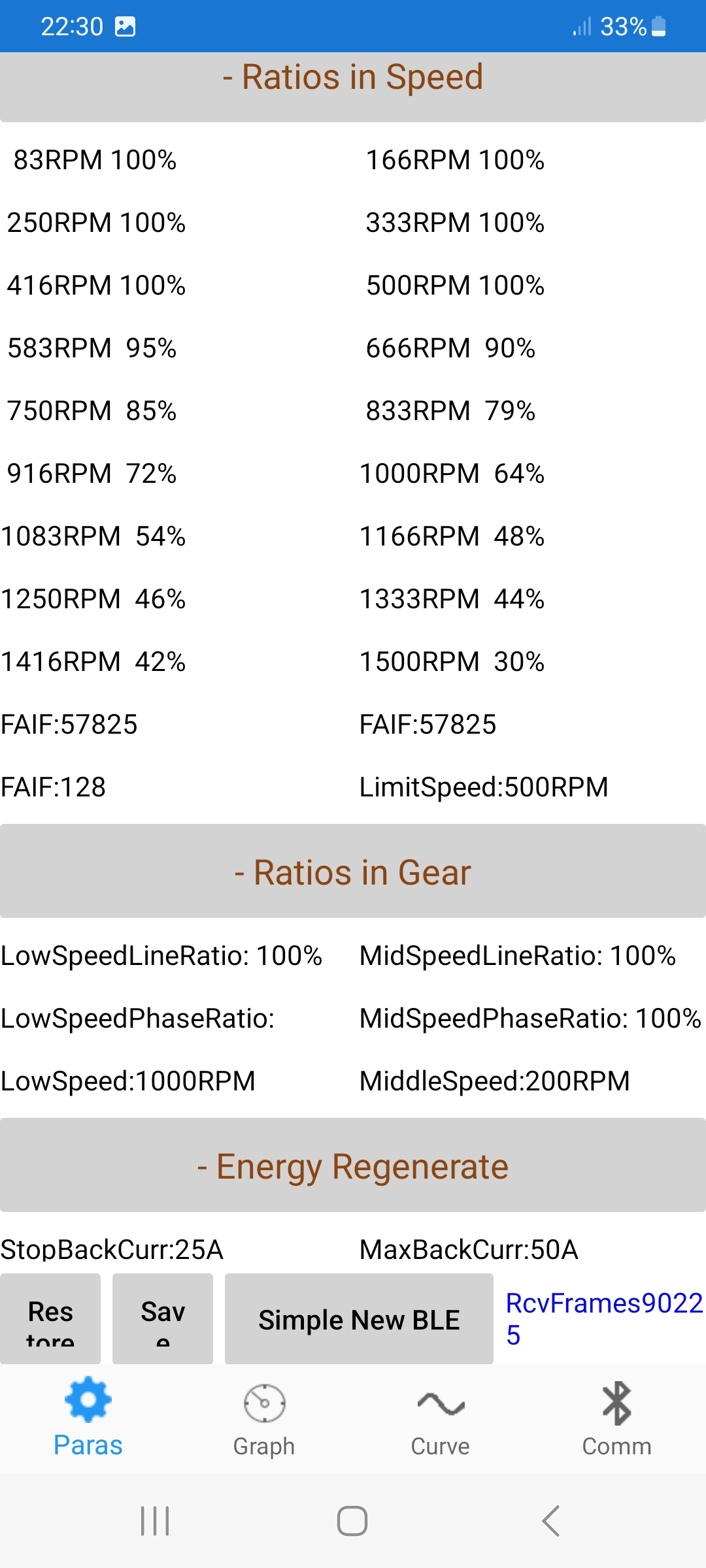 Die abgebildeten Werte sind alle so hoch eingestellt damit ich sehe was maximal an Topspeed geht. Der Controller gibt dann so viel frei das er die DC-Stromgrenze nicht überschreitet. Ich werde ab der Hälfte die Werte wieder runter drehen müssen. Vor den letzten Test stand da ab 500U/min fallende Werte drin, bis hin zu 20% bei 1500. Da wurde dann ab 55 angefangen die Leistung zu reduzieren.