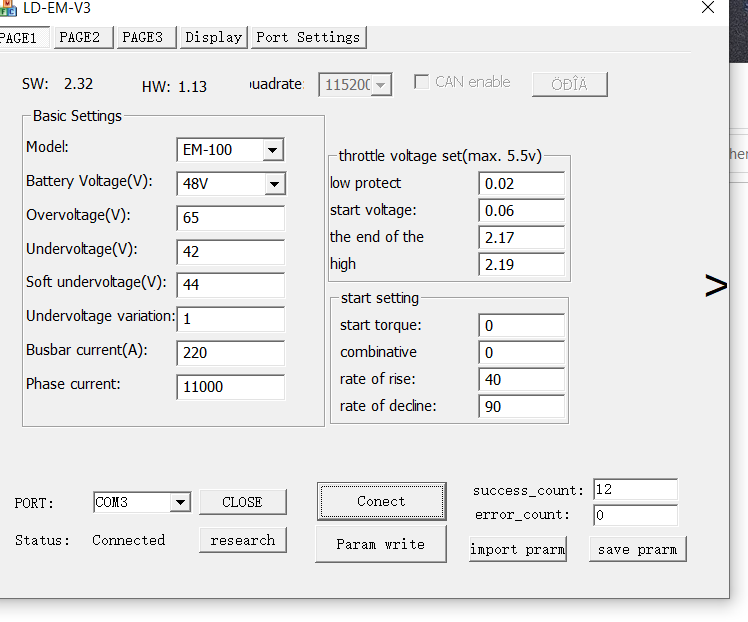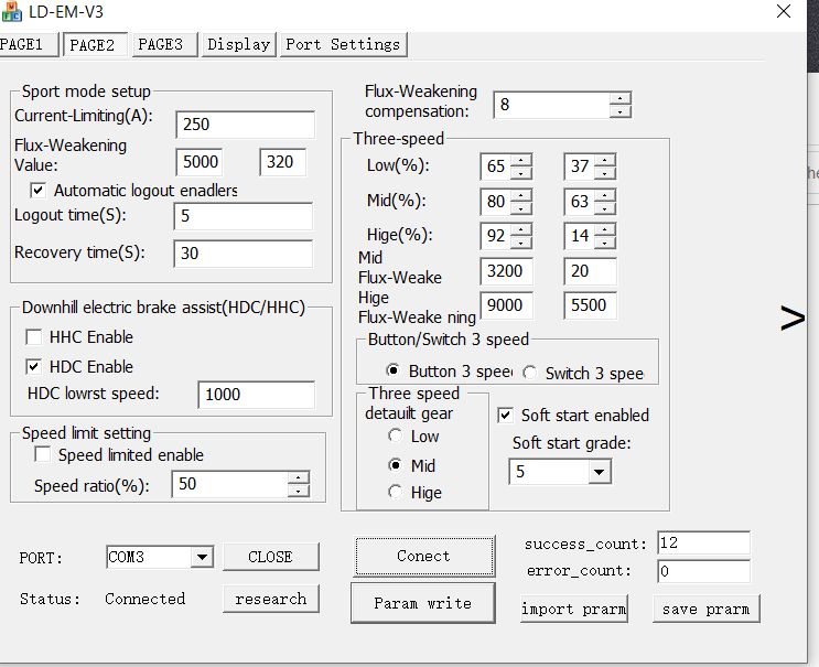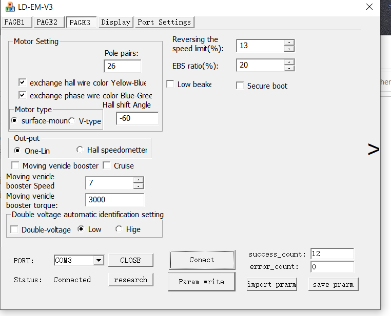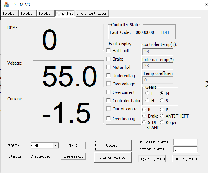 "low beake" (ich übernehme bewusst immer alle Schreibfehler der Chinesen der Eindeutigkeit halber) ist bei mir nicht gesetzt. Diese Seiten werden im Regelbetrieb nicht aktualisiert (nur wenn man im Tab "DISPLAY" ist). Dort erscheint der Radiobutton "R" eher blinkend auch in CITY beim Rollen und "Brake" ebenso beim Bremsen. Generell müsste ich also mal in einer Reku-Phase auf dem Roller den "Conect" auf PAGE3 betätigen um zu sehen, ob die ECU ggf. "low beake" on-the-fly einschaltet. Auch das Bremssignal wird ja per CAN an den MC übermittelt, es gibt keine "Verdrahtung".