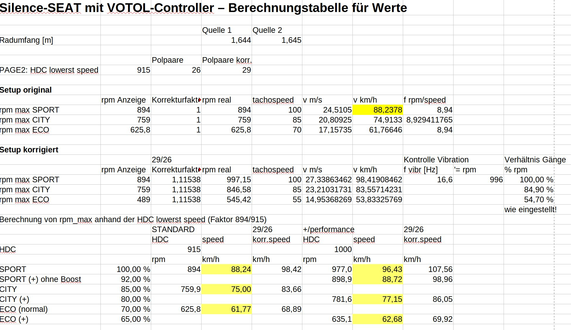 Ein 140/70-14 Reifen hat berechnet 1,645 m Umfang. Damit kann man die Geschwindigkeiten ausrechnen. Sie passen perfekt zu den Realgeschwindigkeiten eines "unkorrigierten" Rollers. Polpaarzahl 26 dürfte also richtig sein für den Motor, die Berechnung für die Geschwindigkeit aus der rpm ist fehlerhaft, wissen wir ja.