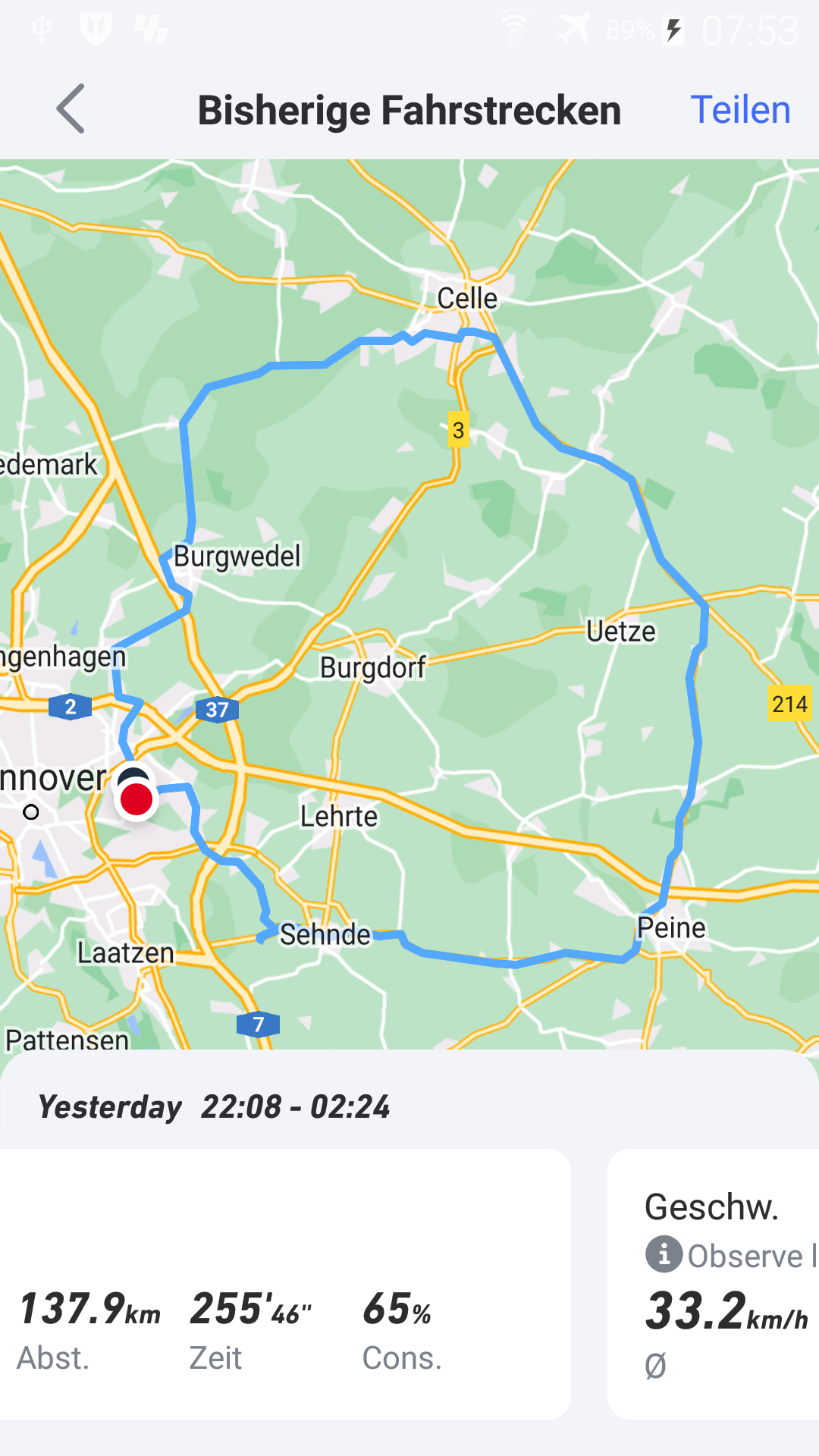 also fast 200 km bis der Akkustand 14% anzeigt. Bin zwar nur 138 km gefahren aber 21 % hätte ich noch fahren können bis er die 14% angezeigt hätte. In Peine musste ich auf 52 km/h gehen wegen der Schnellstraße wo keine Mofas und Fahrräder erlaubt waren. Das hat auch Kapazität gekostet. Also denke ich mal das der noch mindestens 40.000 km durchhält die beiden Akkus.