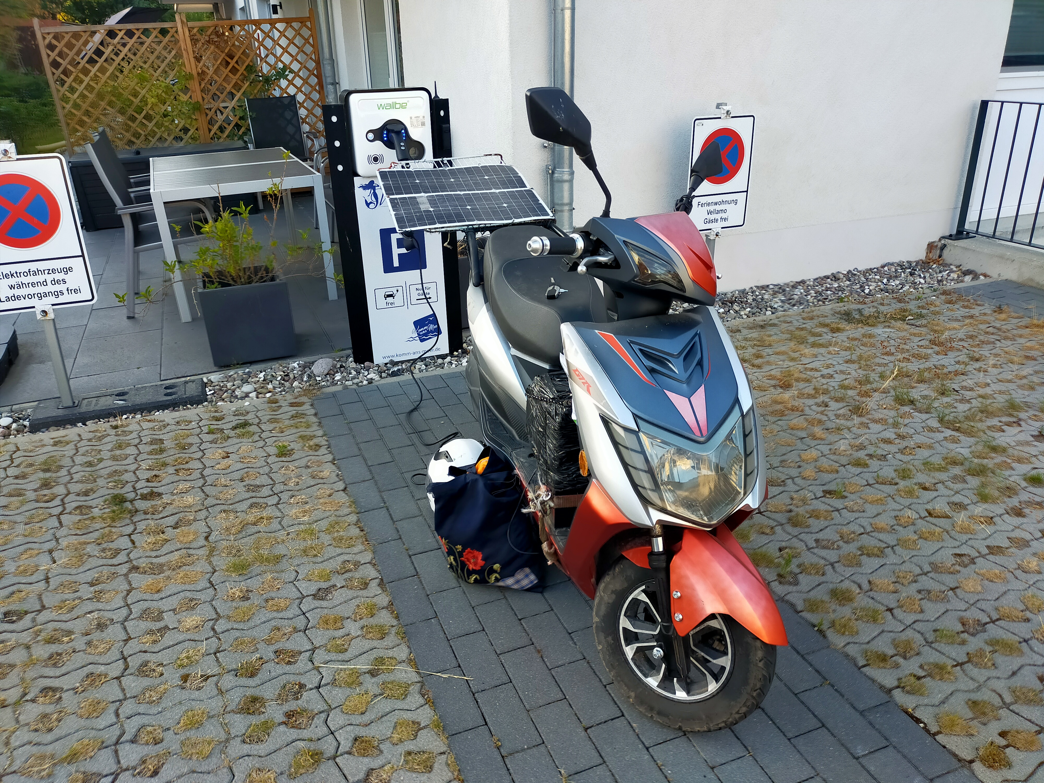 Der Ladestrom, durch die in Reihe geschalteten zwei 12V Solarmodule (ergeben 24 V und dem step Up Laderegler der daraus fast 90 V Ladespannung erzeugt) beträgt von 0.3 A Ladestrom, meist 0,7 A bis mittags 1,0 A, oder im Maximum bei sommerlichem, unverschatteten Solarmodule 1,5 A Ladestrom. Bei dauerhaft unverschatteten, optimal zur Sonne ausgerichteten Solarmodulen, von Sonnenaufgang bis Sonnenuntergang im Sommer, ergeben sich etwa 5 km Reichweite. Ich lade mit dem Original mit dem Roller ausgelieferten Bleigel Ladegerät 230 V 1 A Wechselspannung und laut Aufschrift maximal 2,8 A Ladestrom. Diese Tage werde ich mir eine zusätzliche Ladebuchse einbauen und dann zugleich ein zweites Ladegerät geeignet für 30 Ah 72V Batteriebank zu benutzen. Mehr Ladestrom verträgt die 62 Ah 72 V Bleigel-Batteriebank nicht.