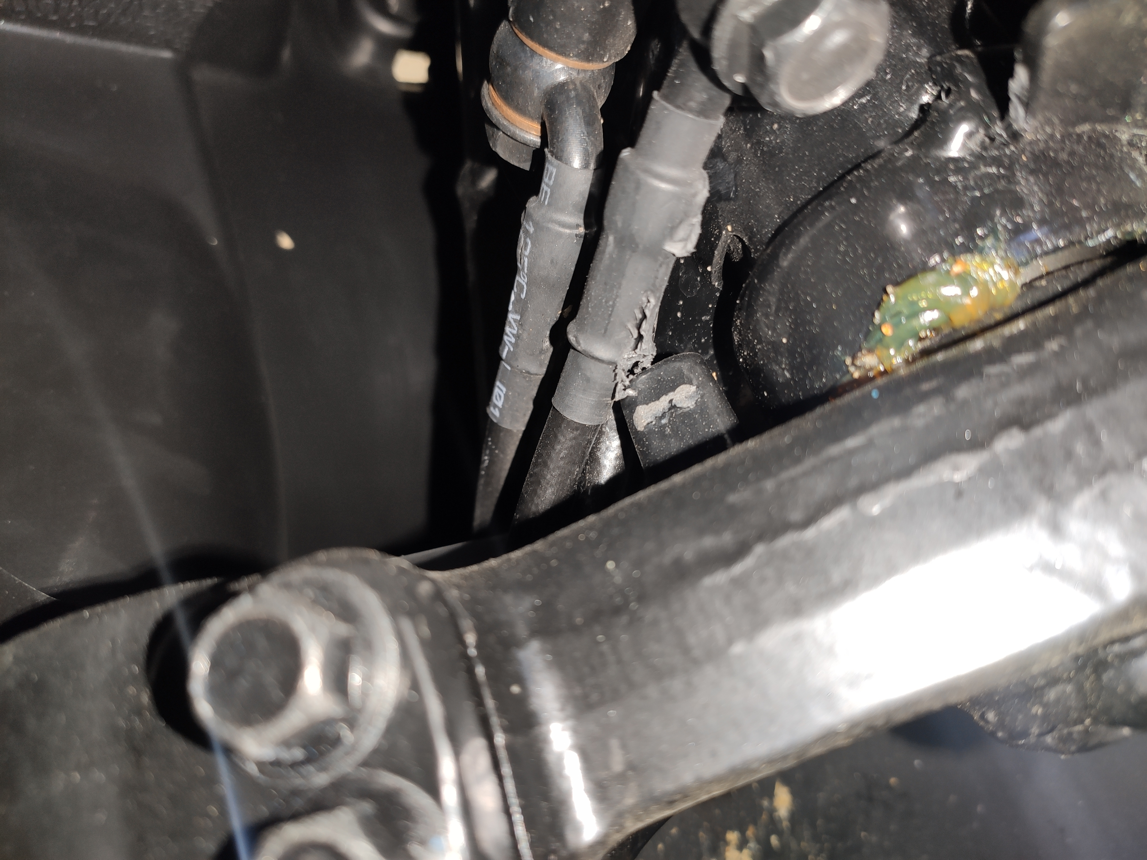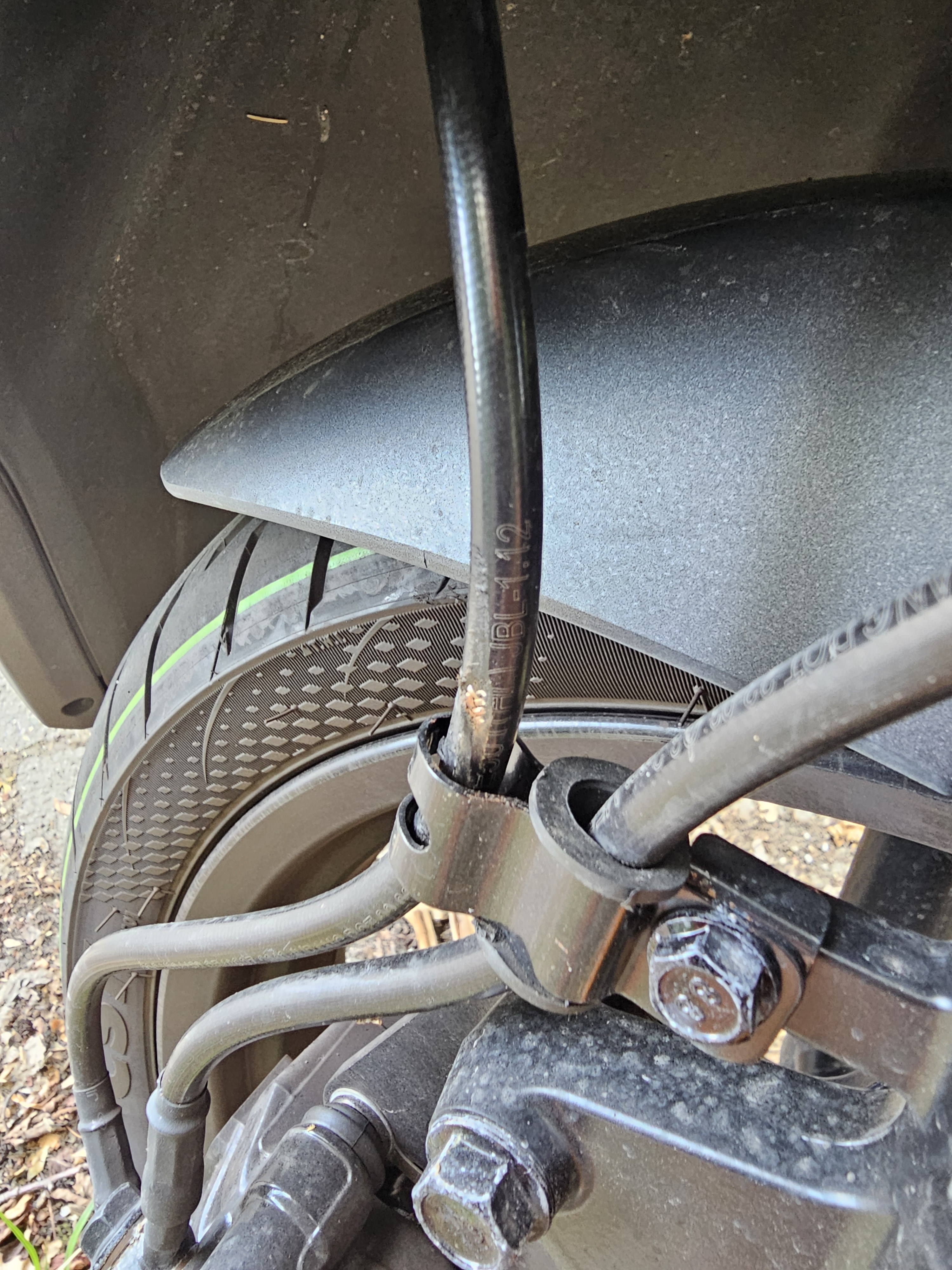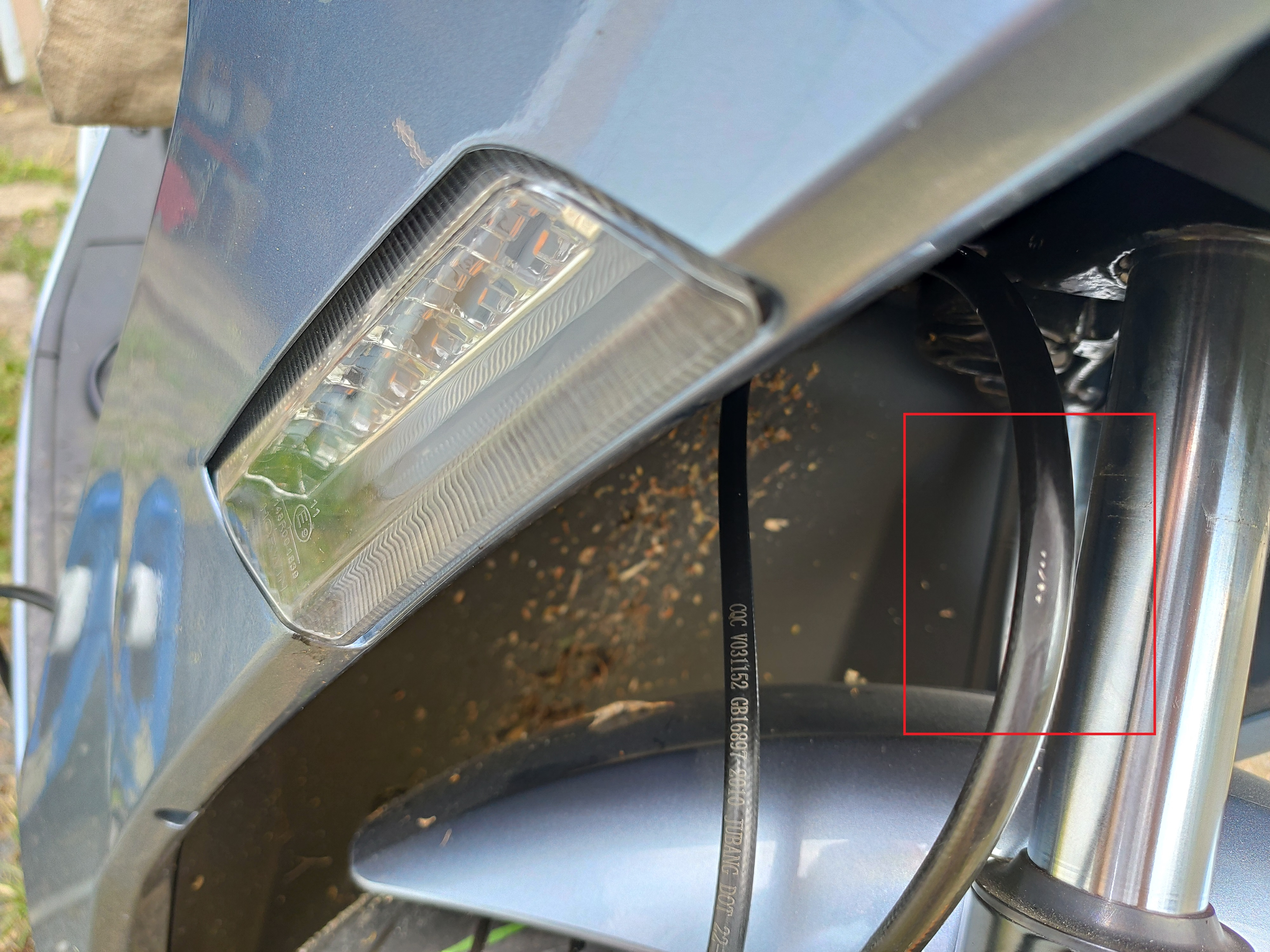 Die Bremsleitung vom Hebel rechts schleift massiv an der Rollerverkleidung und schuppert sich daran auf !!! Das führt potentiell zum Bremsverlust !!! Katastrophe! Mein Roller hat jetzt gerademal 670 km weg und ich sehe bereits den Stahlmantel. Bilder anbei.