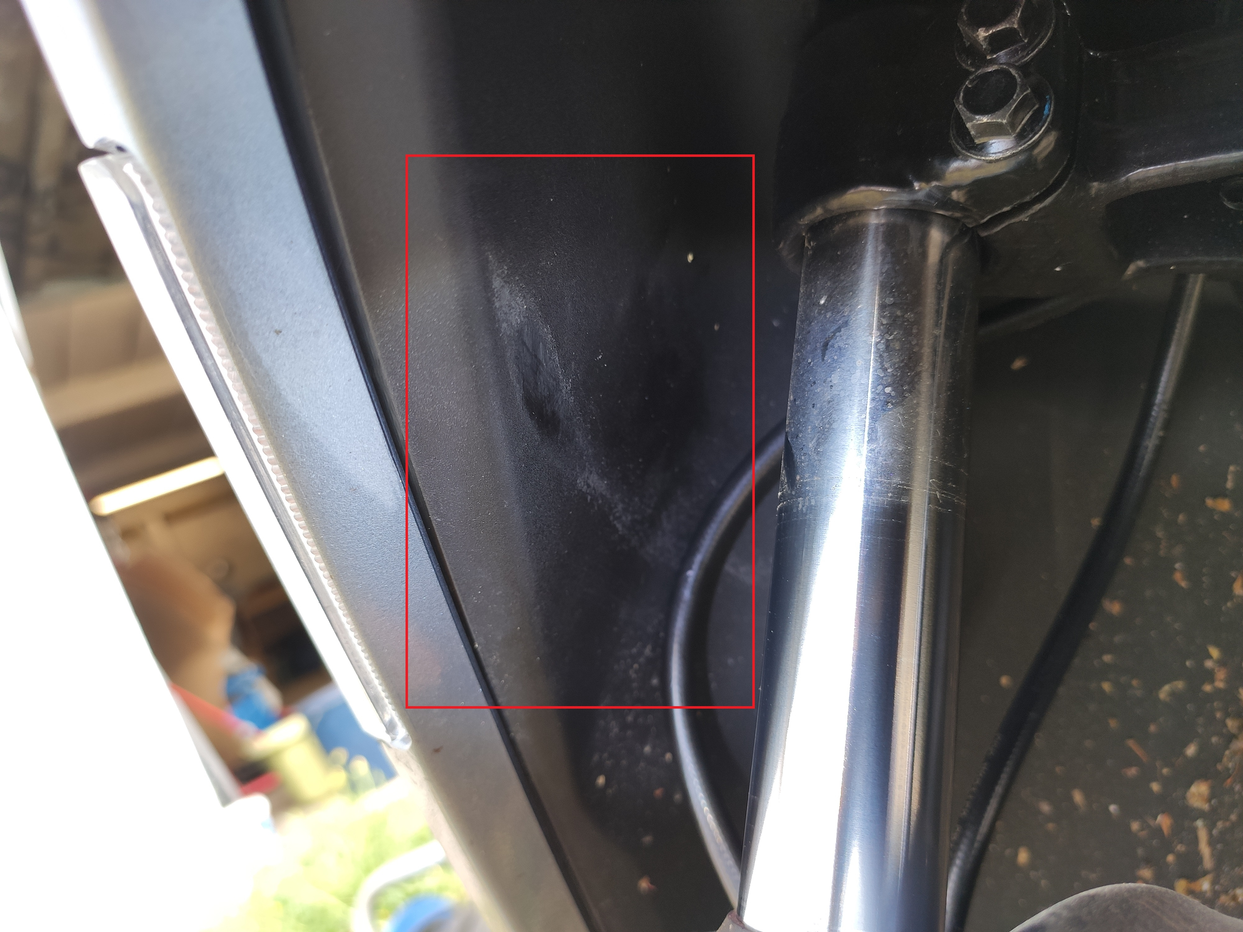 Ich habe bei mir jetzt auch nachgeschaut. So deutlich sind die Abschürfungen an der Verkleidung nicht und auch die Bremsleitung ist an der selben Stelle wie bei dir nicht so durchgeschubbert. Ich habe das Problem jedoch an einer anderen Stelle gefunden. Hier sieht man wie dämlich das konstruiert wurde. Die rechte Leitung läuft durch eine ummantelte Halterung, die linke nicht. Hier sieht man also auch schon die Stahlleitung - und das nach 1200km. Das wird also auch direkt reklamiert.