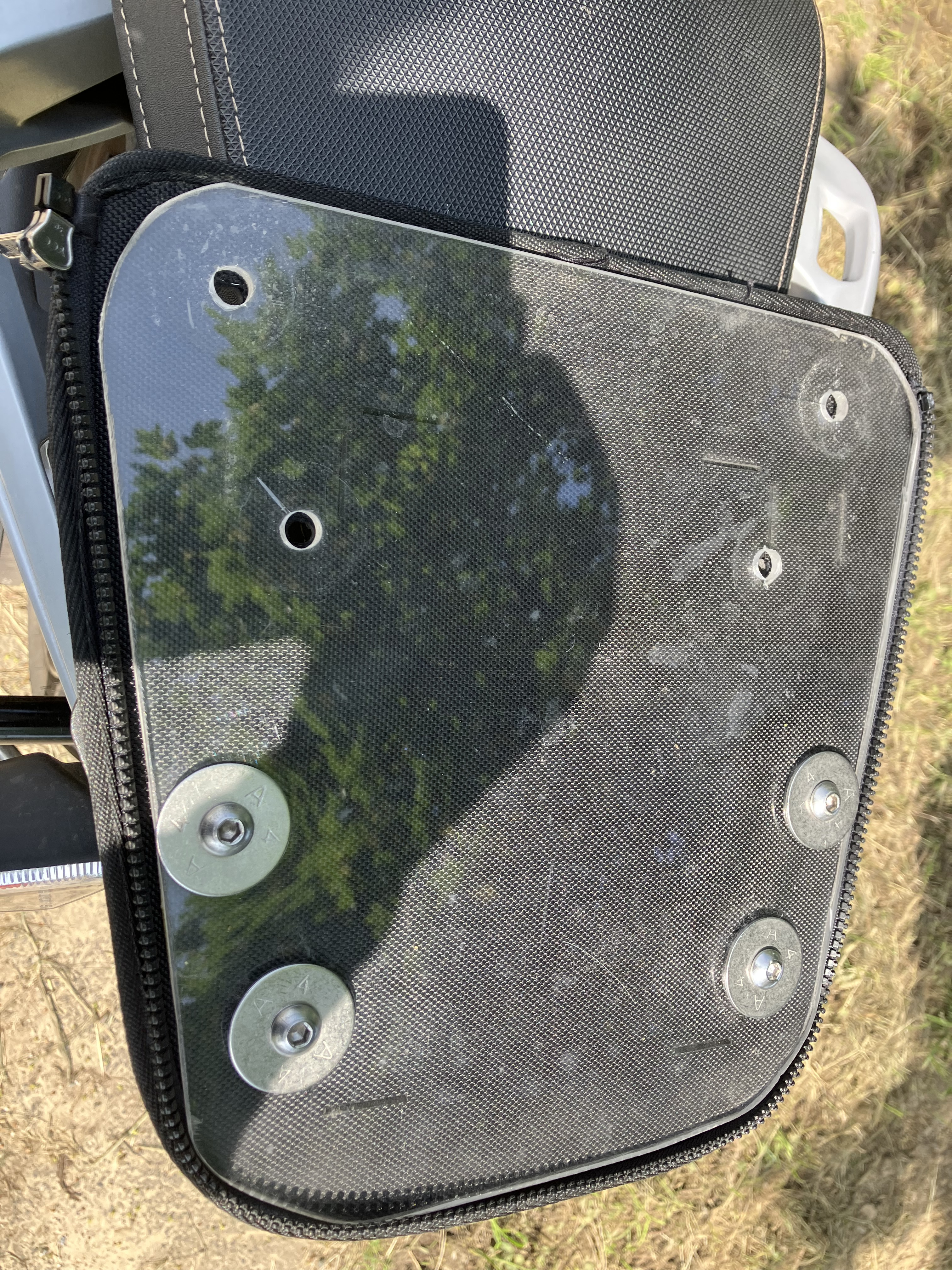 Da die Hecktasche einen weichen Boden hat, wurde eine passende Plastescheibe zwischen Bodenplatte und Tasche, geschoben. Die behindert aber nicht die Bedienung des Reissverschlusses.