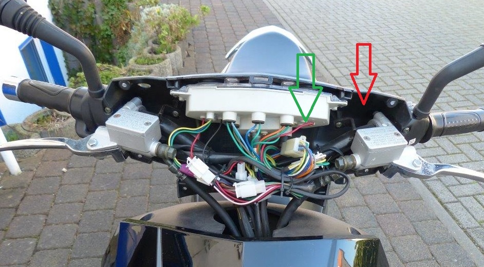 Einbaufotos habe ich leider nicht gemacht, aber auf dem Bild unten habe ich es mal markiert: eingebaut ist das Voltmeter etwa an der mit dem roten Pfeil markierten Stelle, die Kabel habe ich an den Tacho-Anschlüssen mit eingeklemmt (grüner Pfeil). Die ganze Cockpit-/Tachoeinheit zu demontieren und zu öffnen, habe ich mir nicht zugetraut. Und ich weiß auch nicht, ob da genügend Platz gewesen wäre. Ich überlege noch, ob ich einen Schalter (oder Taster) zwischenschalten soll, damit mir das Voltmeter nicht dauernd die Akkus leersaugt