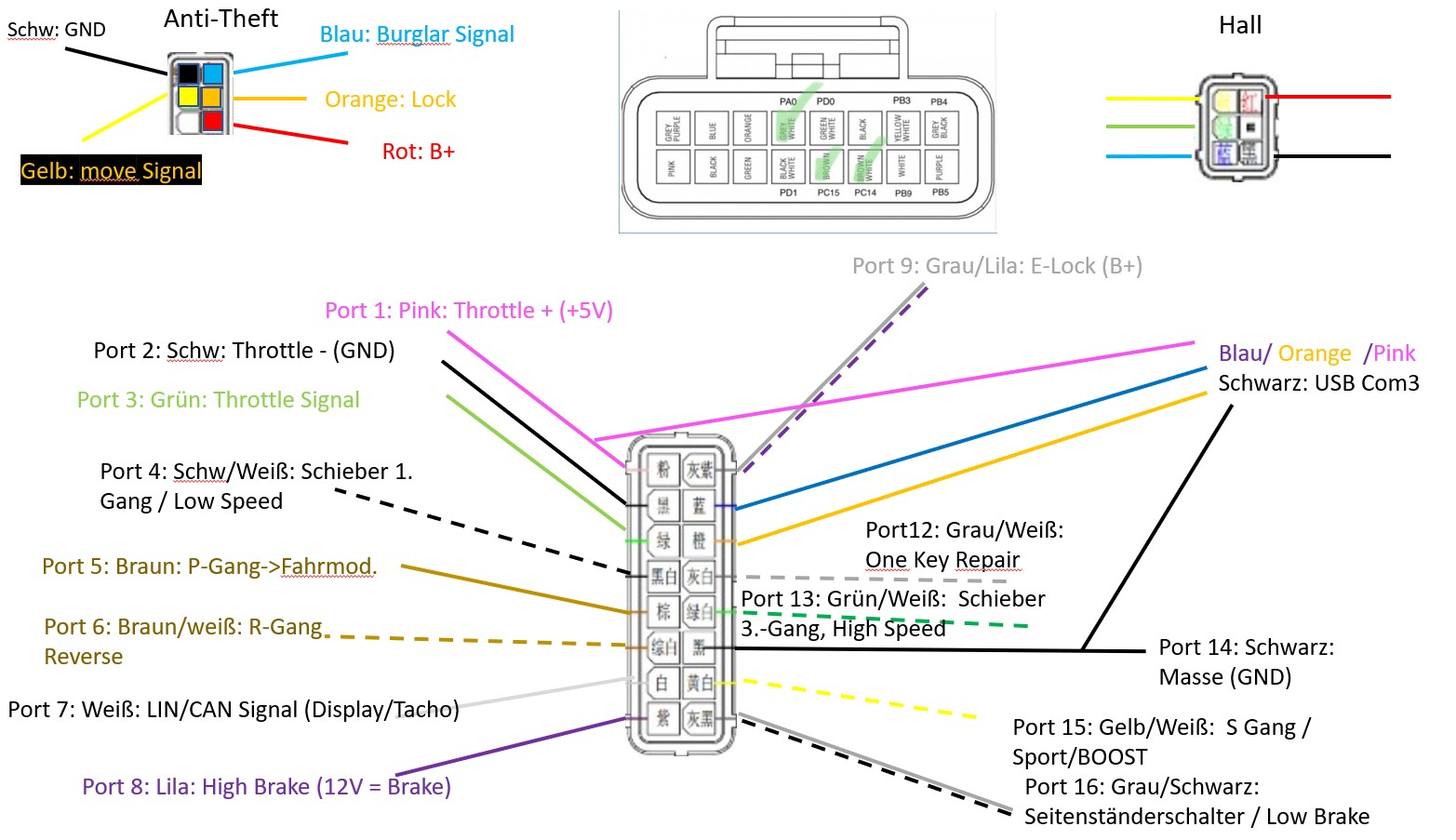 Für die Kommunikation mit dem USB-Teil werden nur drei der vier Adern COM (hier im COM-Stecker des fabrikneuen Kabelbaums belegten Adern) benutzt und zwar - glaube ich - nur Masse (Schwarz) und zwei Leitungen Rx und Tx (Die Stromversorgung des USB-Teils kommt wohl aus dem PC und es braucht den 5-Volt-Pin nicht). Gleichzeitig werden vom Controller die Pins Masse/Minus/GND sowie +5Volt an verschiedene Adern des Origunalkabelbaums herausgegeben. Da ist also Controller-Minus (schwarz) und Controller +5-Volt (oft pink) genutzt für den Stecker zum Gas-Griff und auch für den Com-Stecker (wo dann aber nur Minus zum USB geführt wird).