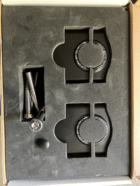 Solide verpackt. Die Schrauben scheinen poliert. Sind 8.8er, kein VA. Sehr gut. Muss meinen aaS mal fragen, ob ich den ZERO Deckel von der Lenkerhalterung, statt die oberen 1/2 Schalen montieren darf. Wäre schön unauffällig.