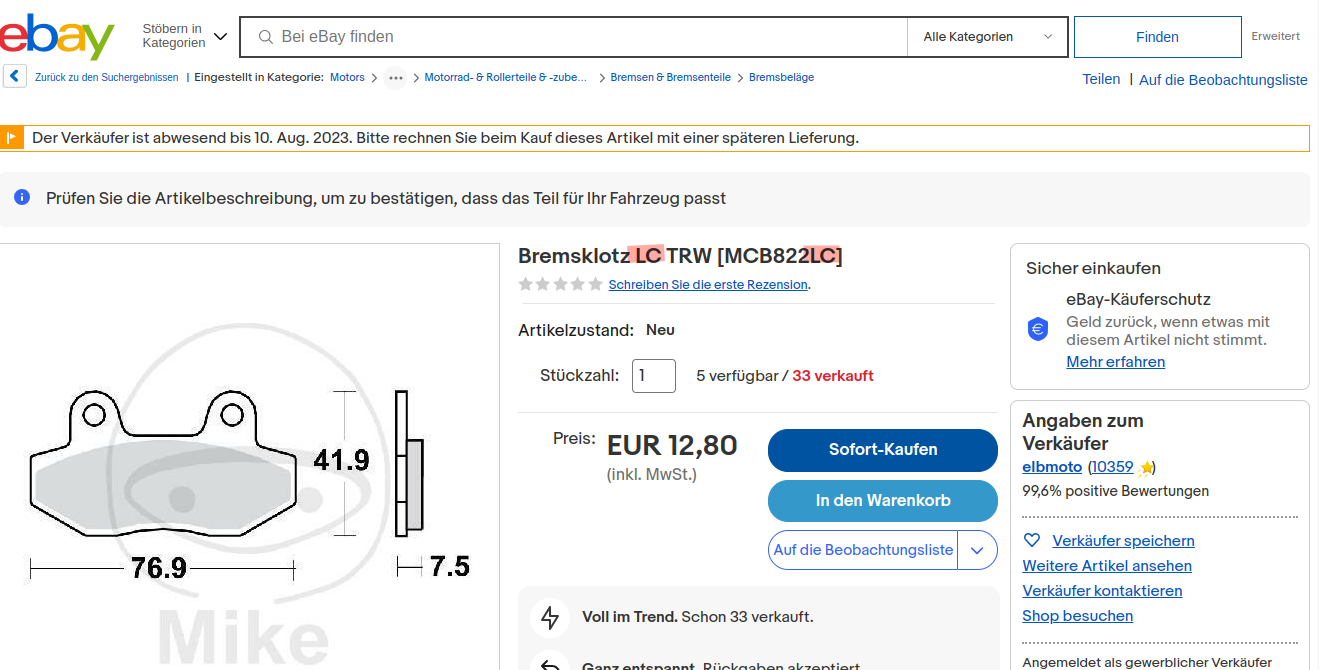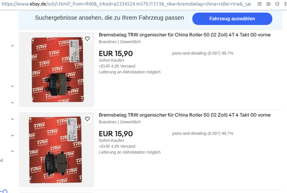Nun frage ich mich aber, welche die richtige Größe wären. Gibt man bei eBay "Bremsbeläge China Roller" ein, erscheinen im wesentlichen zwei Formate zur Auswahl. Und zwar beispielsweise diese von TRW (= Markenhersteller):