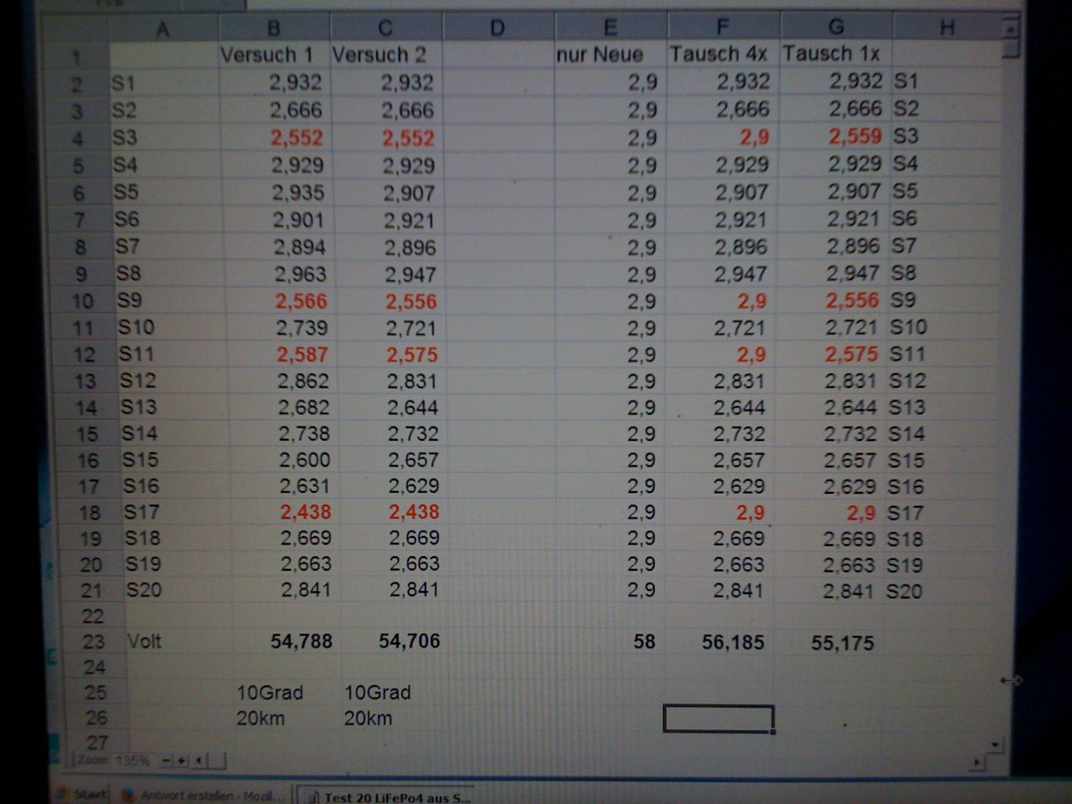 Wenn ich jetzt nur Zelle 17 noch tausche, bringt mir das nur 0, 56 Volt, also 55,17 Volt Gesamtspannung.