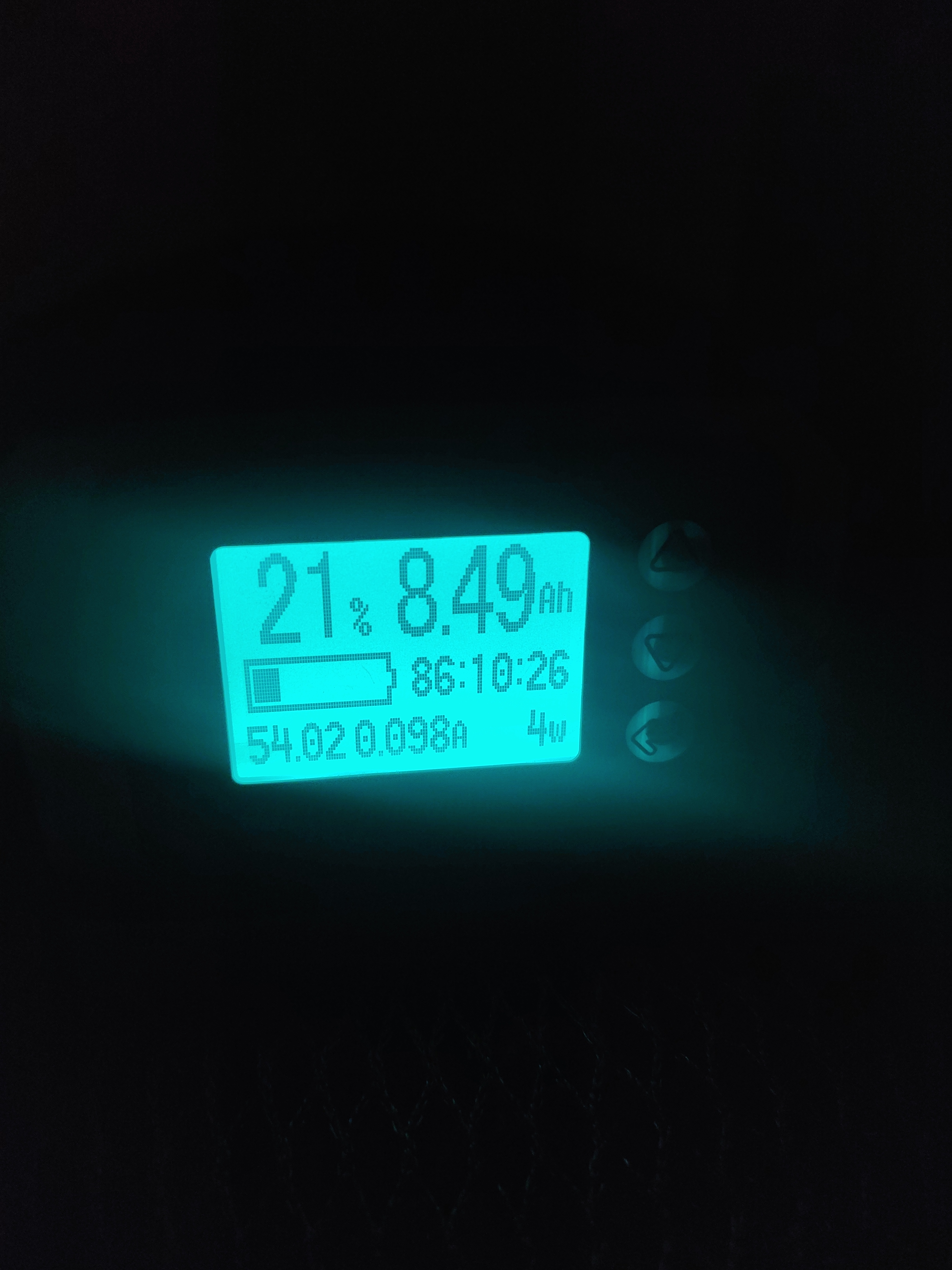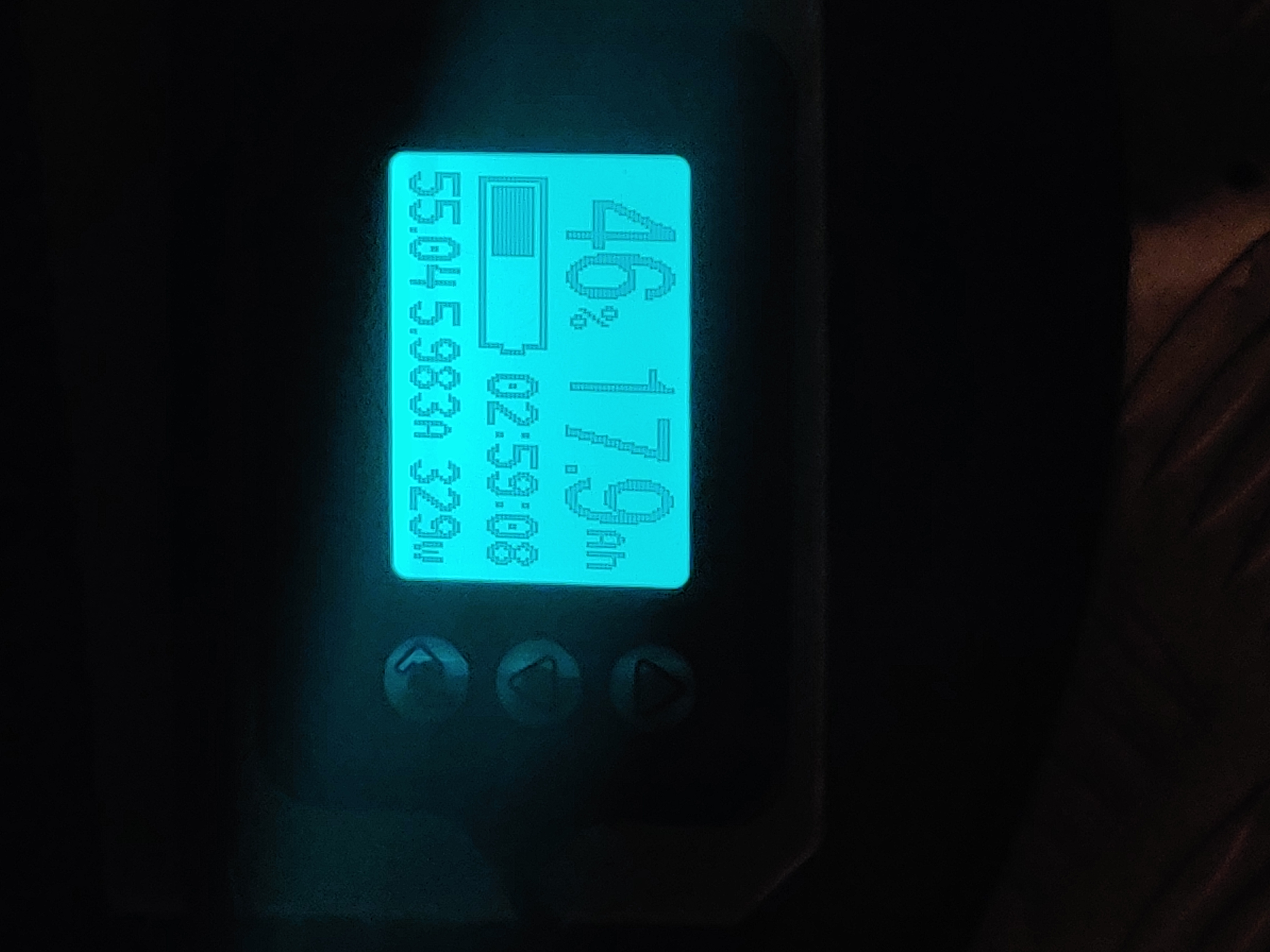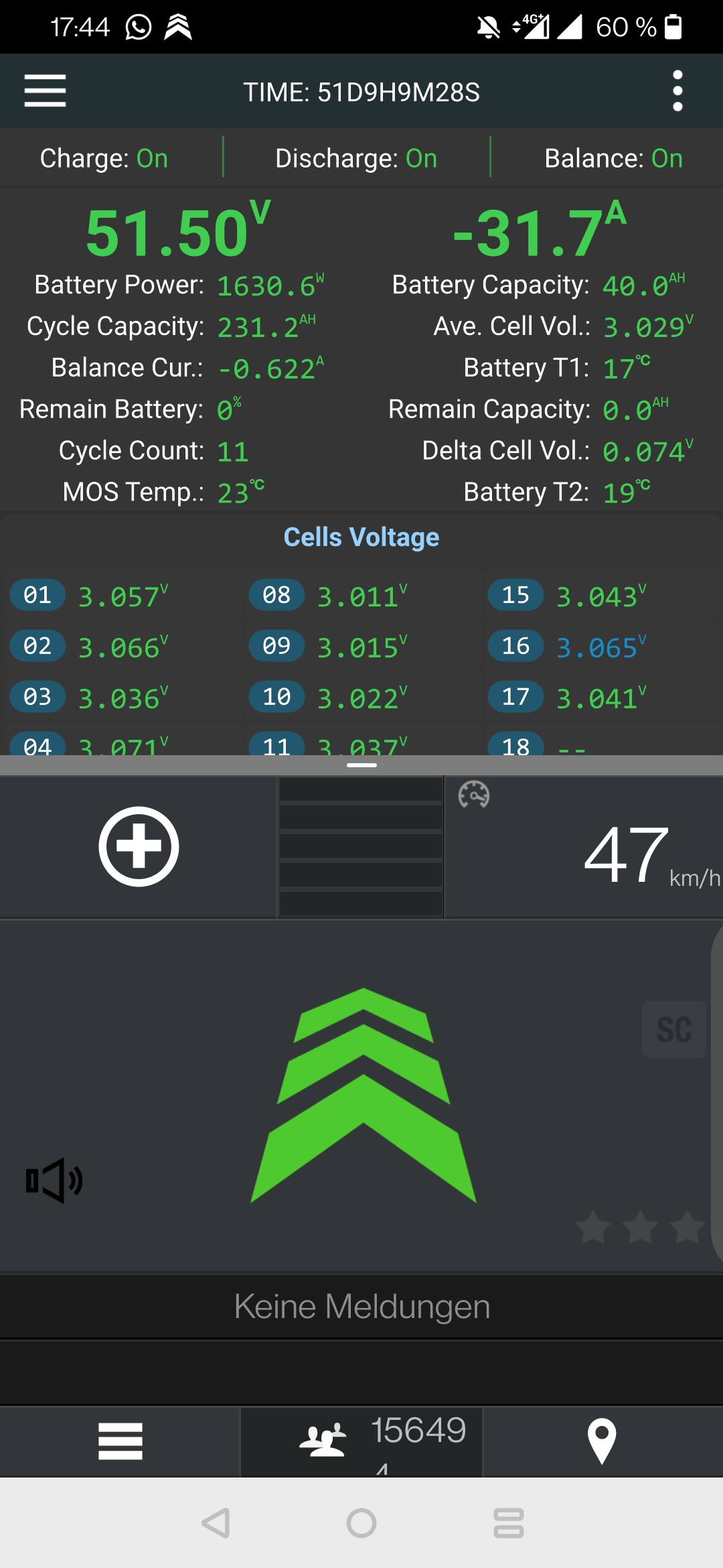 So, jetzt bin ich immer tapfer nach Anzeige vom BMS gefahren und komme im Schnitt mit 12 % Rest zu Hause an, das parallel mitlaufende Coulometer ist dann bei 48 bis 52 %. Heute habe ich dann Mal getestet was noch geht und bin nach BMS Anzeige 0 und Coulometer 46 noch mal 11 km gefahren. Dann waren auf dem Coulometer noch 21%. Das System haut noch 35A raus und Spannung bleibt stabil. Mit den 20S Paket habe ich ja 67 km da müssten mit dem 17S ja um die 45 locker drin sein.