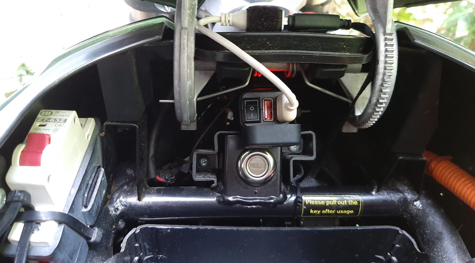 Das habe ich mit Stromdieben an den 12 V Ausgang des DC/DC-Wandlers angeschlossen. Das ist die silberne Box vorne hinter dem Akkufach. Da kommt man ran, wenn man die rechte Seitenverkleidung abmontiert. Das ist keine Raketenwissenschaft.