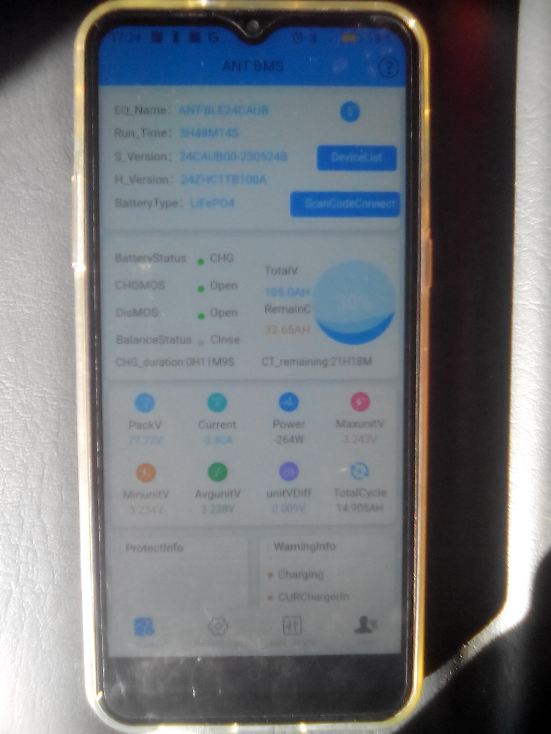 - Software V2.3.2.116 läuft am Android Handy mit Bluetooth Reichweite ca. 22m, Balance erfolgt ab 3,45V nach aktivierten LiFePo4 Parametern