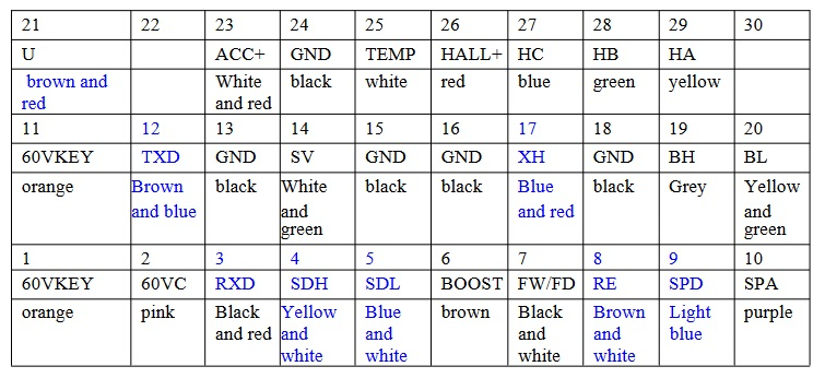 This is "wiring definition" that can be found on Aliexpress etc. As you can see, colors are totaly different from ours. And there is only one pin unused (30, do not look at free 22, it is explained in next text).