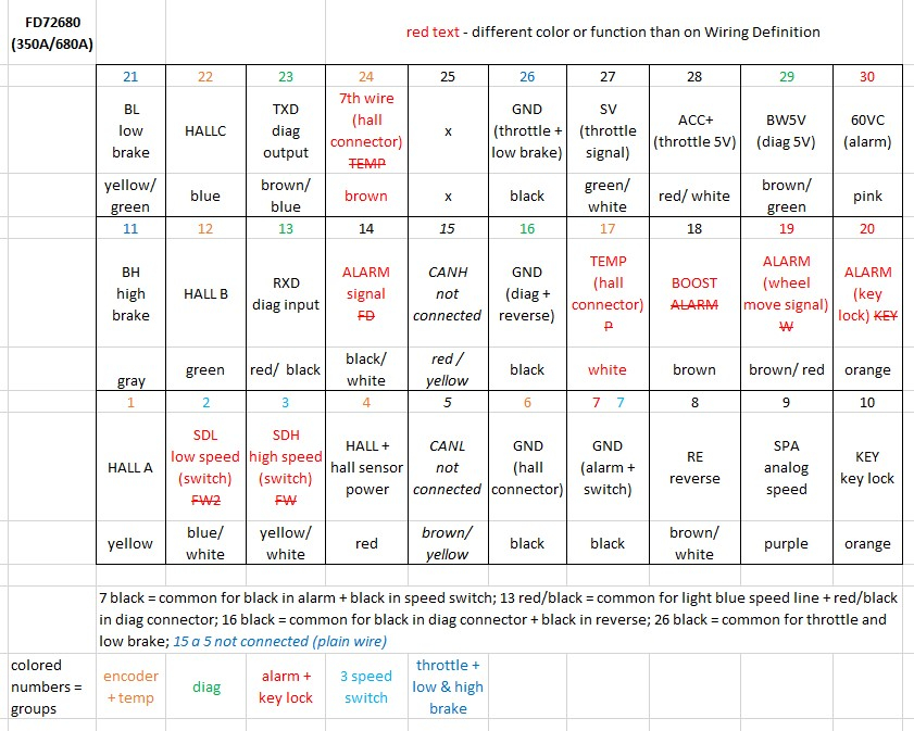 I took harness that came with 72680 and it is similar to that tab from Ali (2nd picture) so I made this tab - I followed every wire to the connector and because it is easy to distinguish them I was able to describe every wire in tab. This is wiring pinout of 72680. Hope I did not mistake somewhere but I am pretty sure I did not. I also hope that this tab can help switch some options to correct pin (at least this is how I understand it works - controller can be said to take signal for specific function from specific pin).