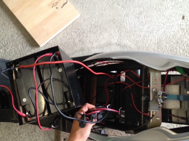 Ich habe noch ein paar Bilder von dem Roller gemacht damit man es besser einschätzen kann wie mit den ersten Fotos. Der Kabelsalat kommt meiner Meinung nach vor allem von den „schwarzen Enden“ (leider fehlt mir der Fachbegriff). Hiermit kann man die Batterien glaube ich wieder auf Gleichspannung bringen. Die schwarzen Enden sowie die schwarze Metallbox inkl. der 2 Akkus werden auch alle nach oben ins Helmfach geführt.