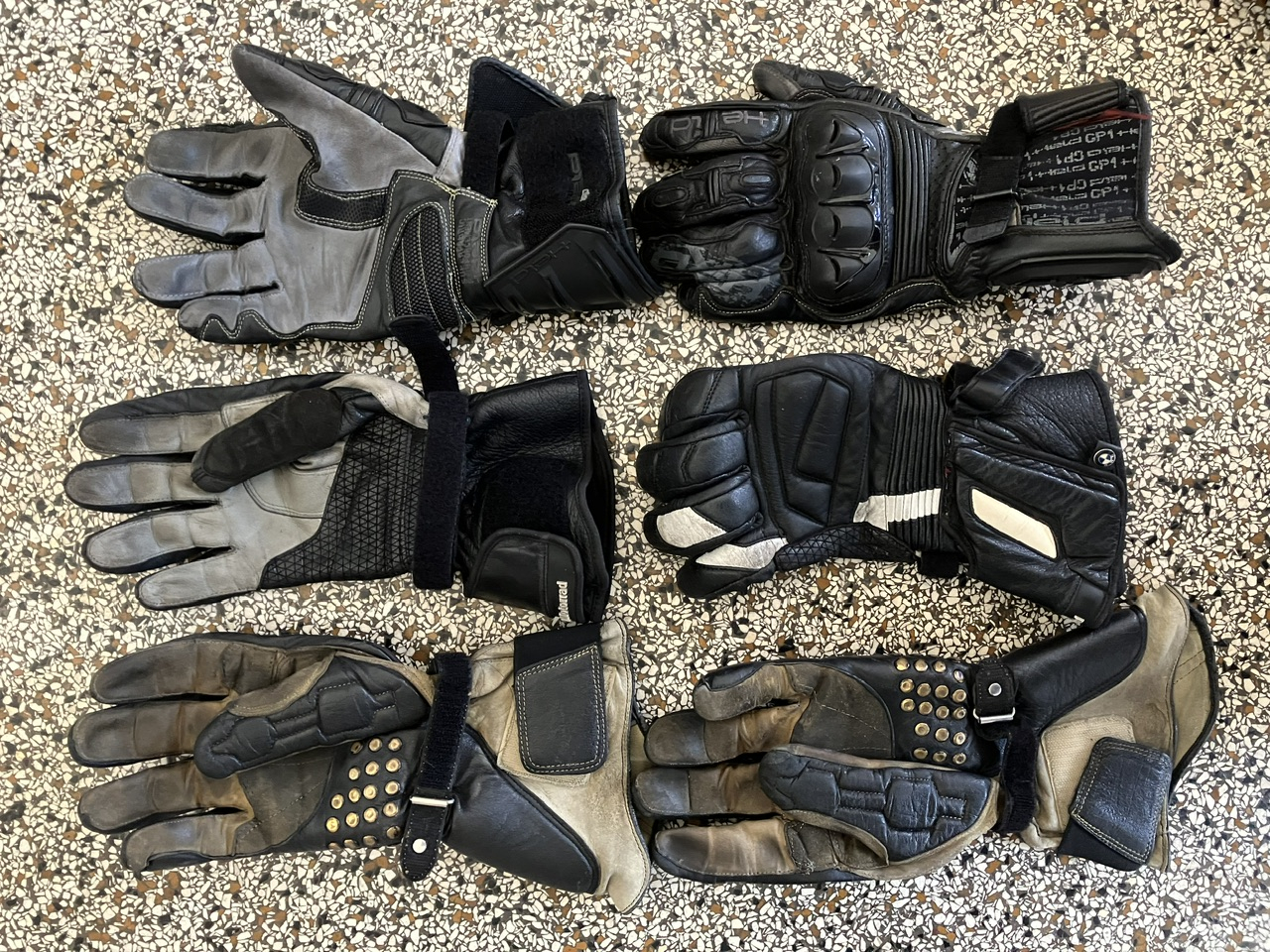 Die Handschuhe unten im Bild sind um die 25 Jahre alt. Damals waren die Nieten im Handballen uptodate. Die Hände sollten nie den Körper als solches abbremsen. Allerdings müssen die Nieten mit Leder o.ä., hinterlegt sein. Würde sonst im Falle eines Falles, vielleicht etwas warm an der Hand.