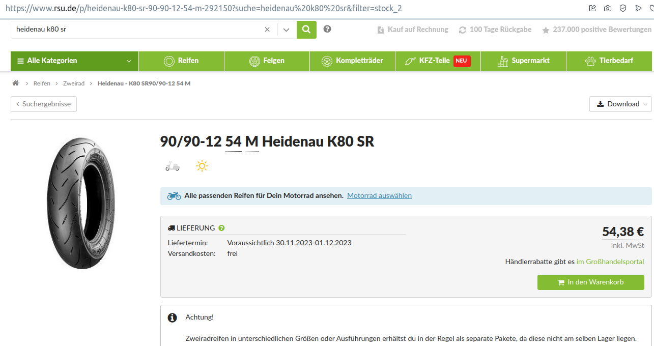 Reifen.com bietet den Heidenau 90/90-12 K58 für 56 € an. Dazu bieten sie eine Reifenmontage "ab 22 €" bei meiner nächstgelegenen Reifenwerkstatt Reifen-Müller an. Da muss ich einmal nachfragen, was die ganze Sache bei Bestellung des Reifens direkt bei dieser Reifenwerkstatt kostet.