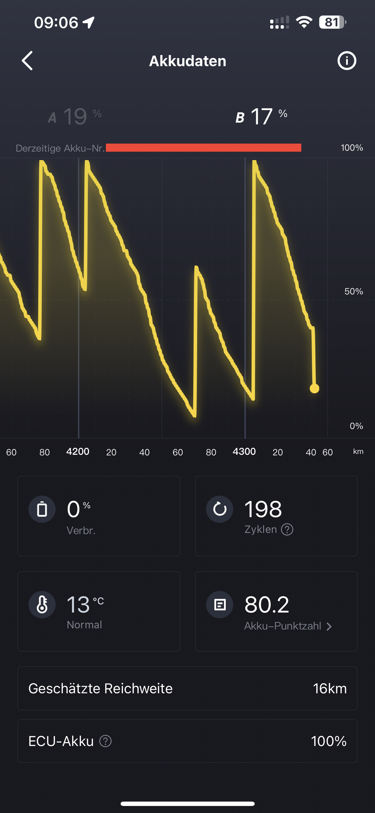 Bei 3744wh Gesamt kwh die beide Akkus haben abzüglich 20% damit man noch genug Puffer hat sind wir bei 2995wh die Nutzbar sind. Teile ich den Wert mit dem Verbrauch pro km komme ich auf 59,9km - 66,56km was eigentlich genau dem entspricht was jetzt angezeigt wird. Aber real ist der Verbrauch nun etwas höher oder wenn wir davon ausgehen das der Verbrauch unverändert ist dann ist es so wie ich glaube das der Akku kastriert worden ist.