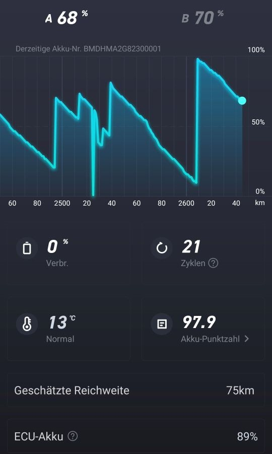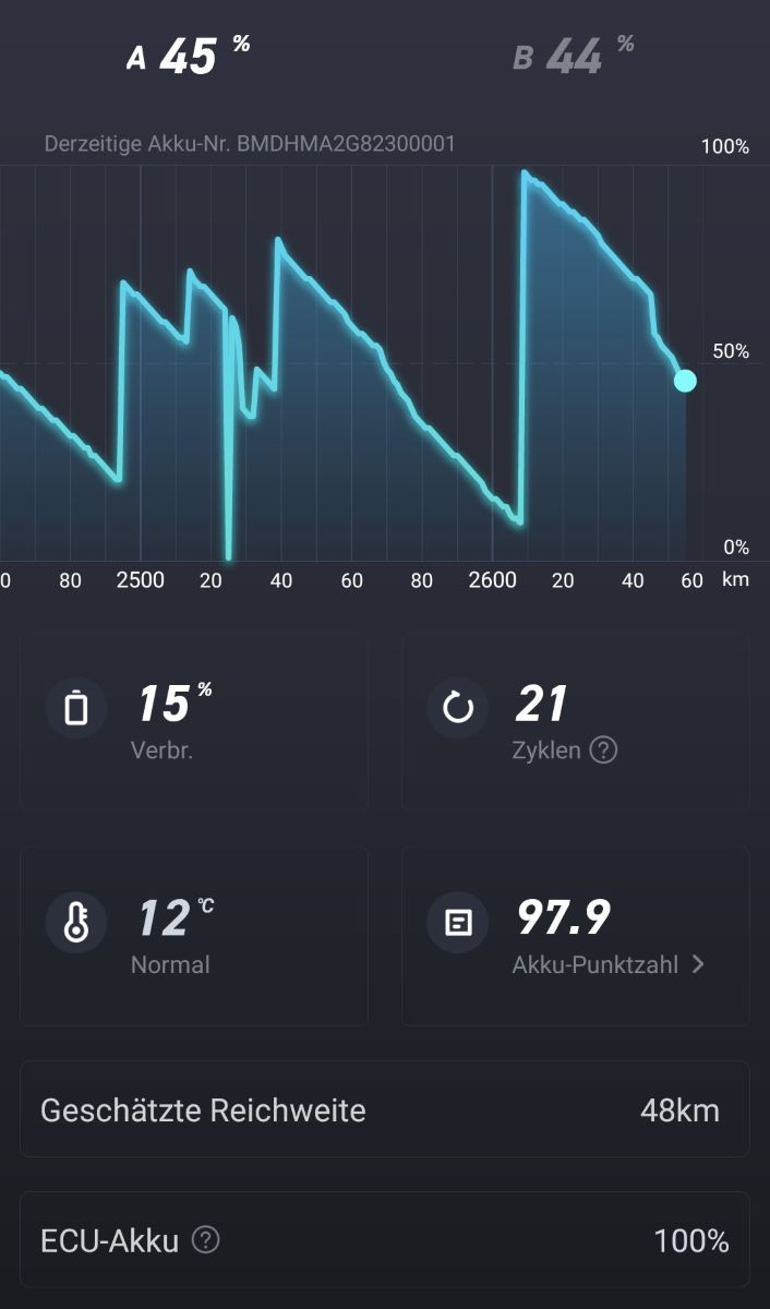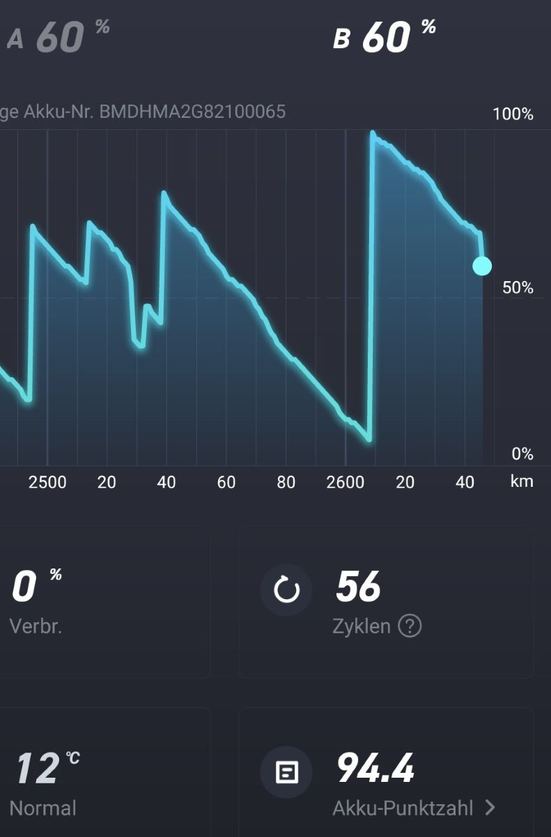 Aber der Reihe nach: Nach 100% Ladung wurde bis auf 69% leergefahren und stand dann ein paar Tage mit abgesteckten Akkus. Nun habe ich die Akkus am 31.10 angesteckt und am 4.11. haben die sich um fast 10% entladen. Zwischendrin mal diese seltsame Anzeige mit scheinbar nur einem Akku aber der Reichweite von beiden... Auf einer kleinen Tour (mit dem Rad war es mir heute viel zu Windig) wurden die Akkus auf 45% entladen, völlig gleichmäßig. die Akkus habe ich dann wieder auf 66% geladen. Seltsamer Weise hat sich die Zyklenzahl nicht erhöht. Ob es an BMS V06 liegt ? und abgesteckt. Jetzt bleibt die EVO mal so stehen. Ich denke den ECU Akku muß man abschaltbar machen. Das schützt den ECU Akku vor Tiefentladung bei abgesteckten Akku und ermöglich einen ECU Kaltstart. Ich denke gerade an einen Schalter unter der FIN-Klappe.