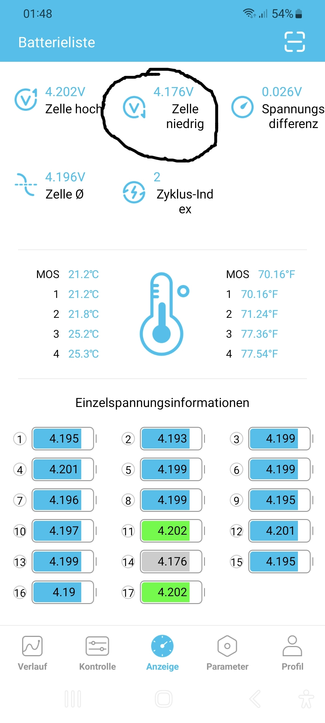 Inzwischen habe ich den Akku natürlich wieder geladen. Die Einzelspannungen sind dicht beisammen, nichts auffälliges.
