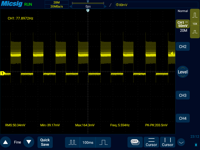 Akku gezogen, eingesteckt - nix. Aber die gemeldeten 0.03V haben mich interessiert. Und tatsächlich finde ich mit dem Multimeter am Akkupack eine pulsierende Spannung mit Werten zwischen 20 und 60 mV (Mittelwert schwankend, Bargraph pulsierend), also raus mit dem Oszi und die untenstehenden Aufnahmen gemacht.
