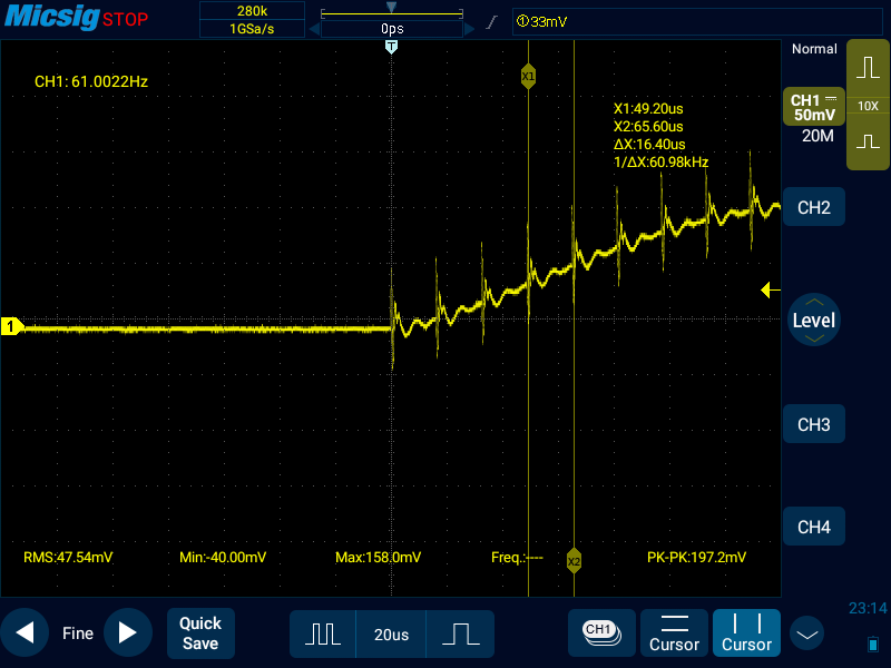 Akku gezogen, eingesteckt - nix. Aber die gemeldeten 0.03V haben mich interessiert. Und tatsächlich finde ich mit dem Multimeter am Akkupack eine pulsierende Spannung mit Werten zwischen 20 und 60 mV (Mittelwert schwankend, Bargraph pulsierend), also raus mit dem Oszi und die untenstehenden Aufnahmen gemacht.