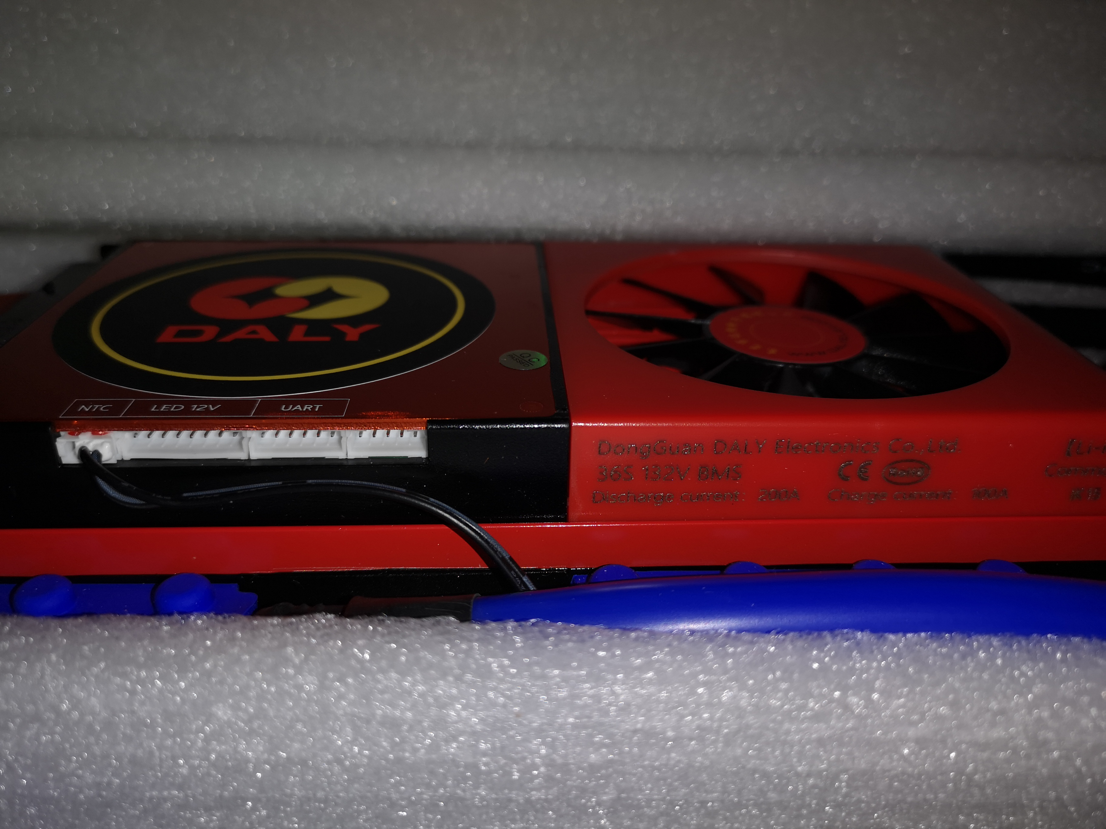 Die Bestellung bei Daly hat wohl geklappt. Heute ist das BMS angekommen. Die Spezifikationen sind so wie erwartet: 36s - LiIon 3,7V - 200/300A - Bluetooth-Adapter. Daly hat die Gebläse-Variante als Basis gewählt. Das Dingens ist eine ziemliche Wuchtbrumme. Die Kabel für P- und B- sind jeweils doppelt ausgeführt in 2AWG (35 Quadratmillimeter).
