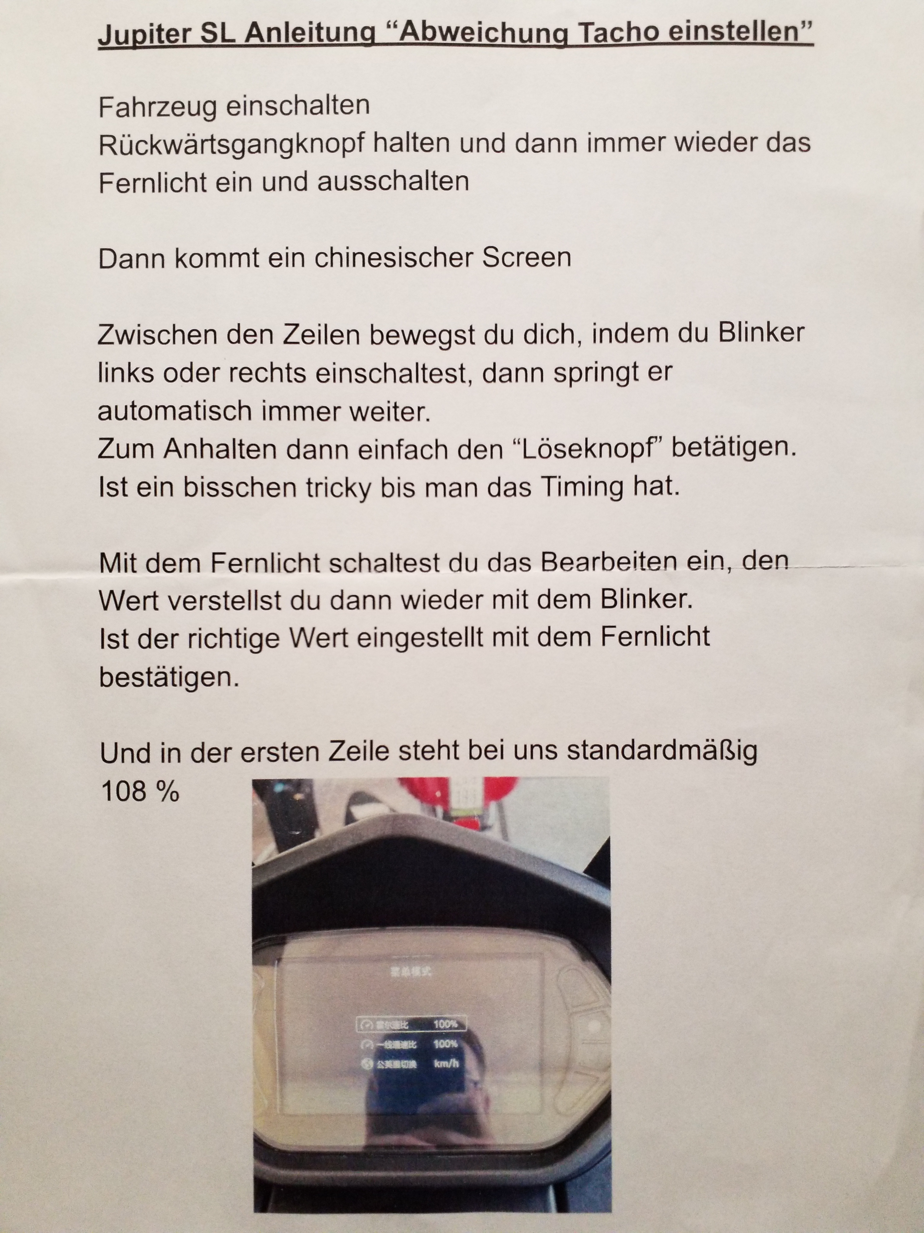Hallo in die Runde, ich lese schon eine Weile mit und möchte gern etwas mit Euch teilen, was mir der der Inhaber meines Rollerladens in Leipzig besorgt hat. Das mit den "Chinesischen Kilometern" hat mich immer gestört. Um Abhilfe zu schaffen hat er mit diese Beschreibung beim Händler besorgt. Ich habe es nicht selber umgesetzt, sondern der Ladenbesitzer hat es beim Routinecheck mit erledigt. Es funktioniert bei mir zumindest. Die Höchstgeschwindigkeit liegt jetzt bei 112 "Deutschen Kmh".Die Originalreifen von Kenda habe ich dieses Jahr nach 20 000 Kilometern gegen Pirellis Allwetterreifen "Angel Scooter " getauscht. Ein Unterschied um Welten. Sichere Straßenlage, kleinerer Wendekreis, ganz anderer Kippwinkel um eine Kurve anzusteuern und das Flattern des Vorderrades bei ca. 70 kmh hat spürbar nachgelassen. Ein neues Lenkungslager war nach ca. 15 000 Kilometern auch fällig. Jetzt bin ich in 15 Monaten bis auf diese "Kleinigkeiten" 26 000 Kilometer gefahren. Und jeden Tag werden es 110 km mehr. Soviel zu meinem "Langzeitexperiment". Motek, ich verfolge dein Langzeitexperiment mit großer Freude, bin übrigens aus Taucha, also aus Deiner Nähe. Gruß Henne