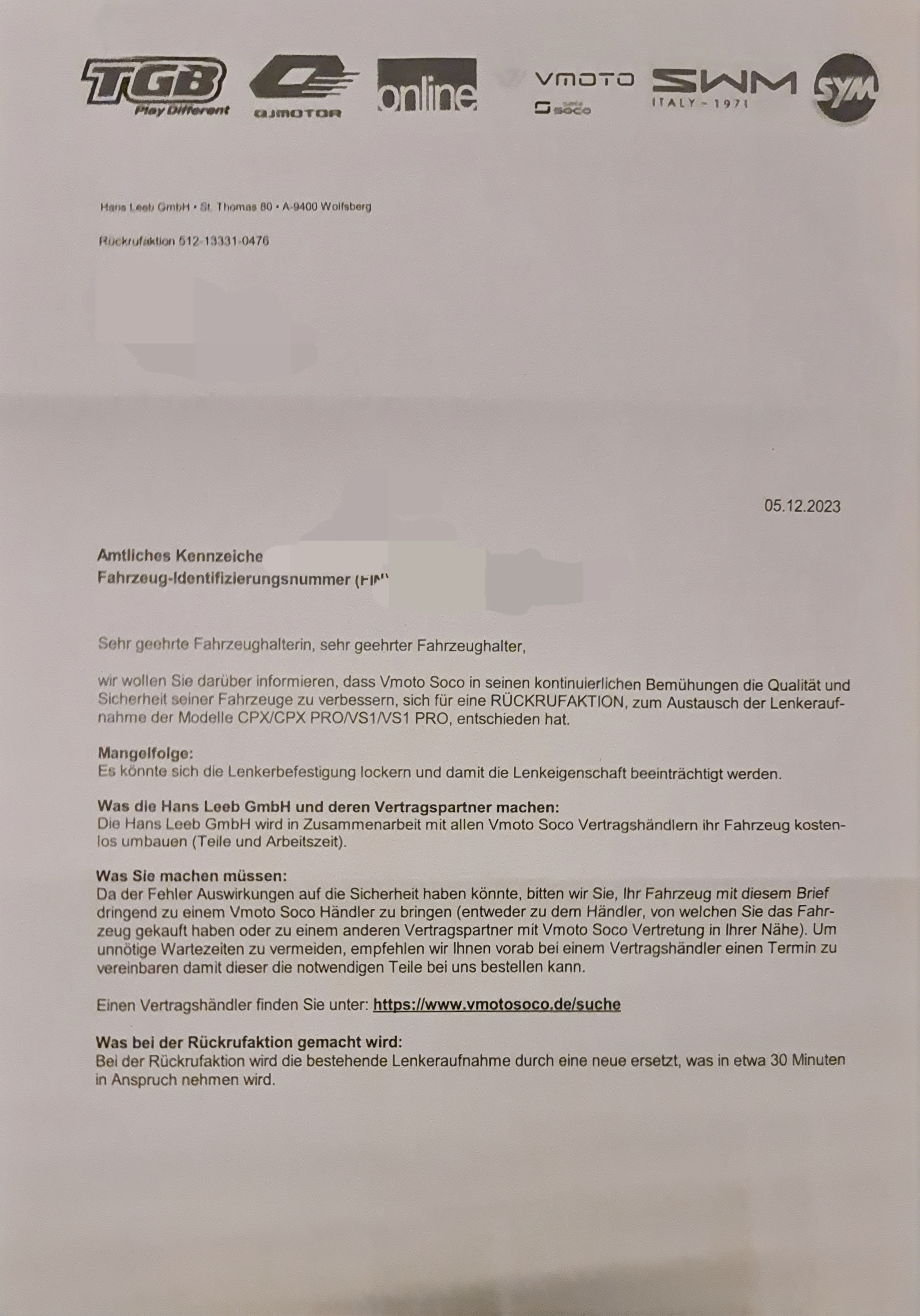 Ja, ich konnte es unter der Nummer und unter VMOTO auch nicht finden.rainer* hat geschrieben: ↑Fr 8. Dez 2023, 09:41In der KBA-Rückrufdatenbank ist (noch?) nix zu finden.