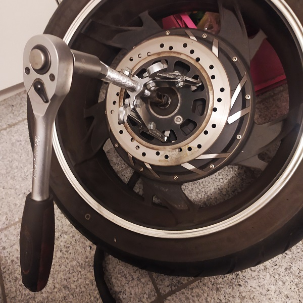 Danach die kleinen Imbusschrauben auf der Kabelseite (gegenüber der Bremsscheibe) entfernen und mit einem handelsüblichen Abzieher den Motor demontieren. Das ist ohne Kraftaufwand möglich.