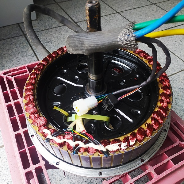 Nach Abstecken des Akkus den Hallstecker abgesteckt und die drei dicken Motorkabel am Controller abgeschraubt. Beide Kabelstränge bis zur hinteren Schwinge ( die beiden Metallklemmen innen an der Schwinge aufbiegen)durchgezogen. Den hinteren Bremsbacken mit Halteplatte demontieren