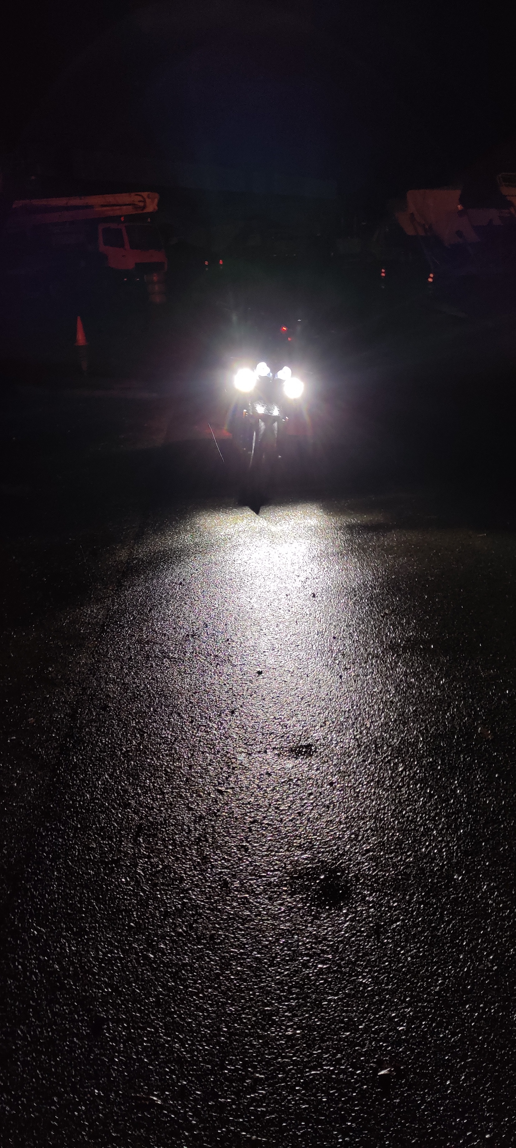 - Der Unterschied ist riesig. Auch hier habe ich Fotos bei Tag und bei Nacht gemacht, aber der Nachtmodus meines Handys belichtet immer fleißig nach, sodass der Unterschied auf den Fotos zwar erkennbar ist, aber in der Realität ist er nochmal deutlich größer. Ich kann diese Zusatzscheinwerfer dringend empfehlen. Die Funzel der Odin ist im Grunde nicht tauglich um damit bei Nacht zu fahren. Mit diesen Zusatzscheinwerfern bin ich sicher unterwegs. Richtig gut!