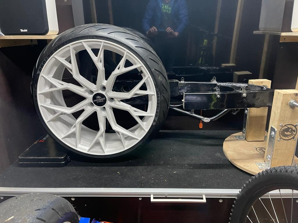 Das Aufziehen des Motorradreifens (260/35-21“) auf die Autofelge (9x21“) hat mit mehreren Anläufen schlappe 45 Minuten gedauert aber jetzt sitzt er!