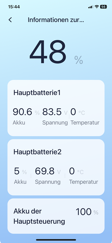 Das sieht so aus, als ob Akku 2 nicht richtig angeschlossen ist. Dringend laden, sonst leidet der Akku bei den Temperaturen bis zum k.o.